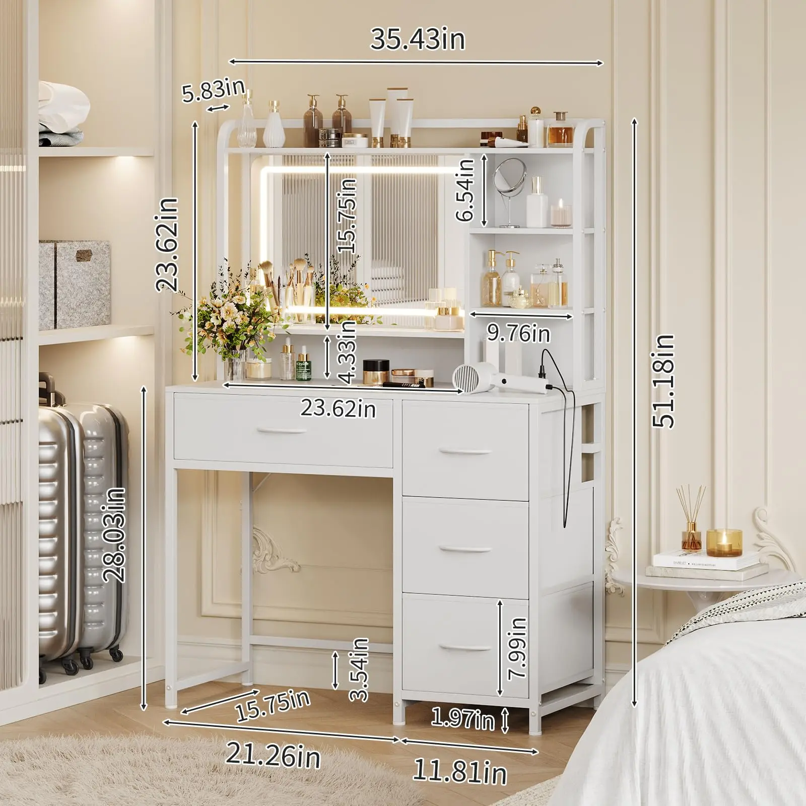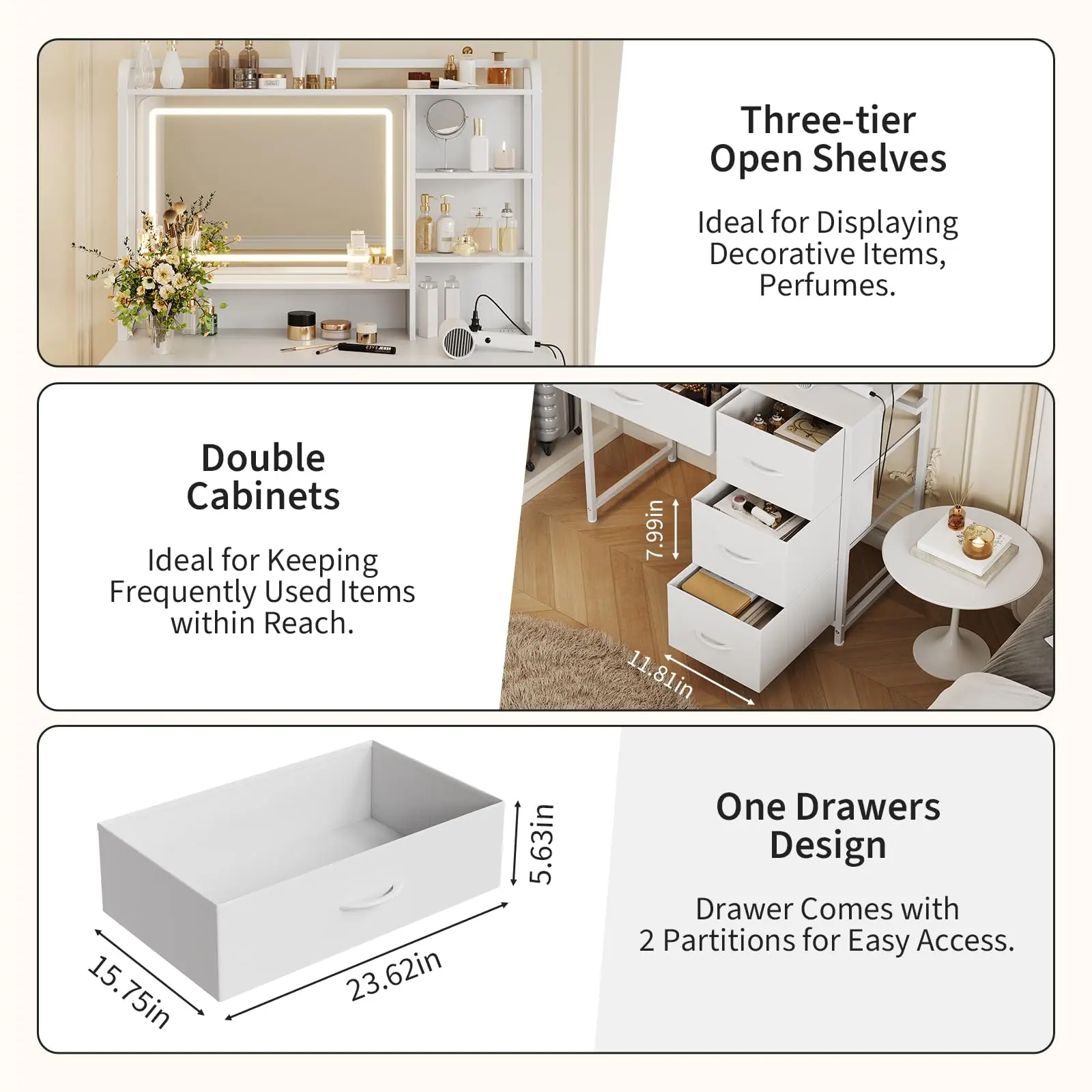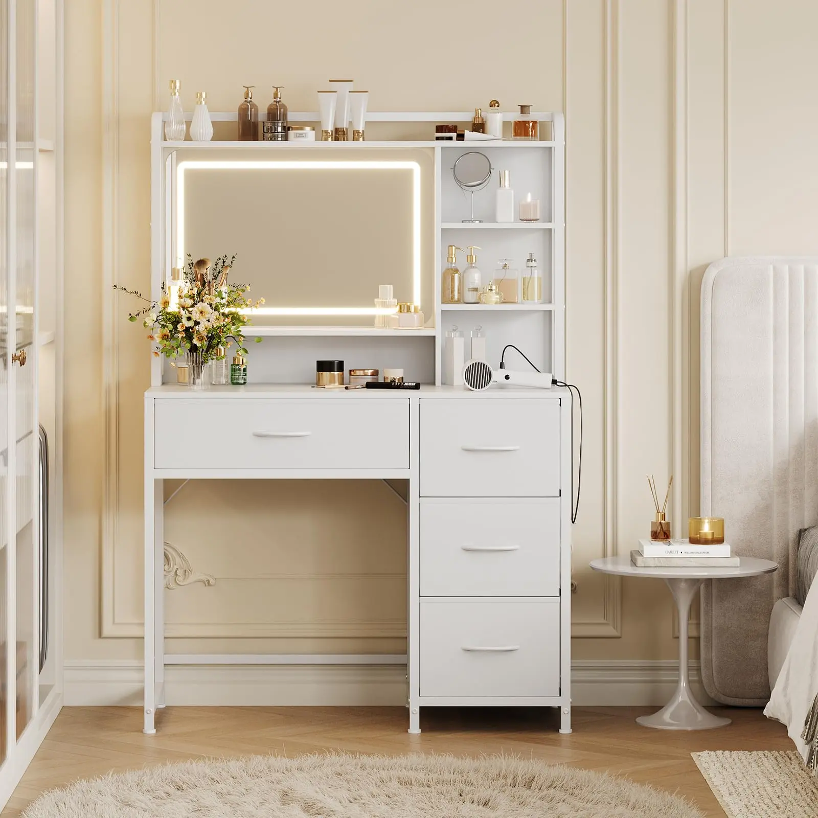· 4 Fabric Drawers & Open Storage - Equipped with four fabric drawers and multi-level shelves, this vanity desk keeps cosmetics, skincare products, and accessories neatly organized and easy to access.