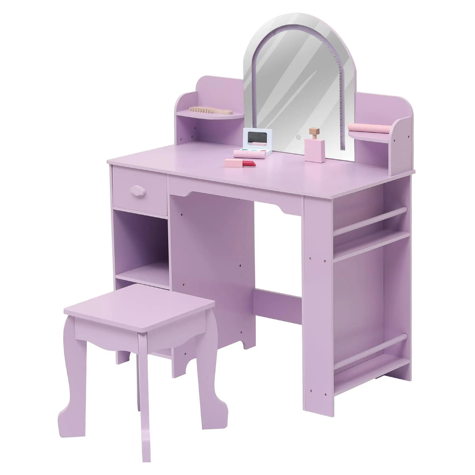 Garvee Vanity Set for Young Girls with Illuminated Mirror, Adjustable LED Light, Wooden Makeup Station, Stool, Storage Drawer, and Shelves - Suitable for Ages 3 to 9