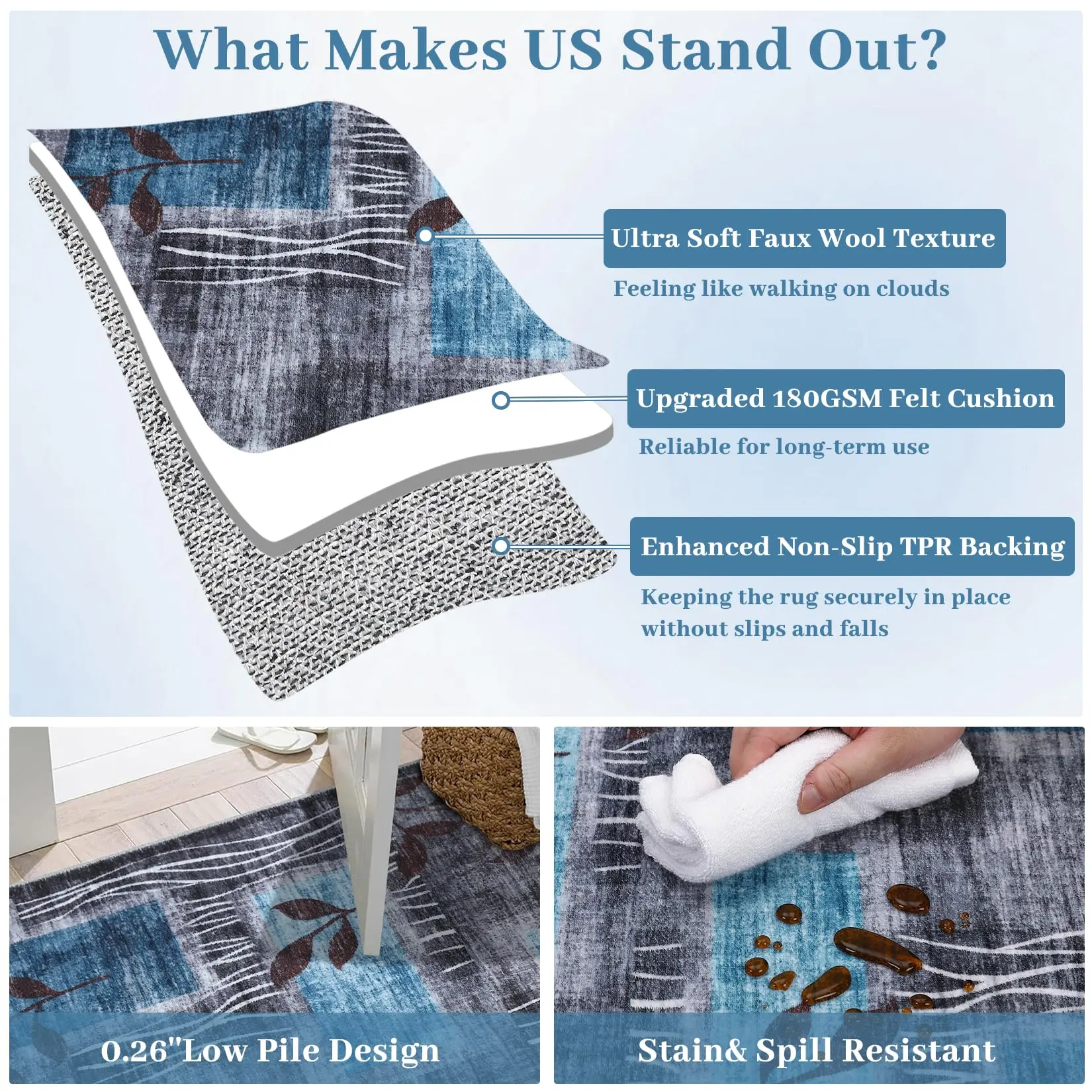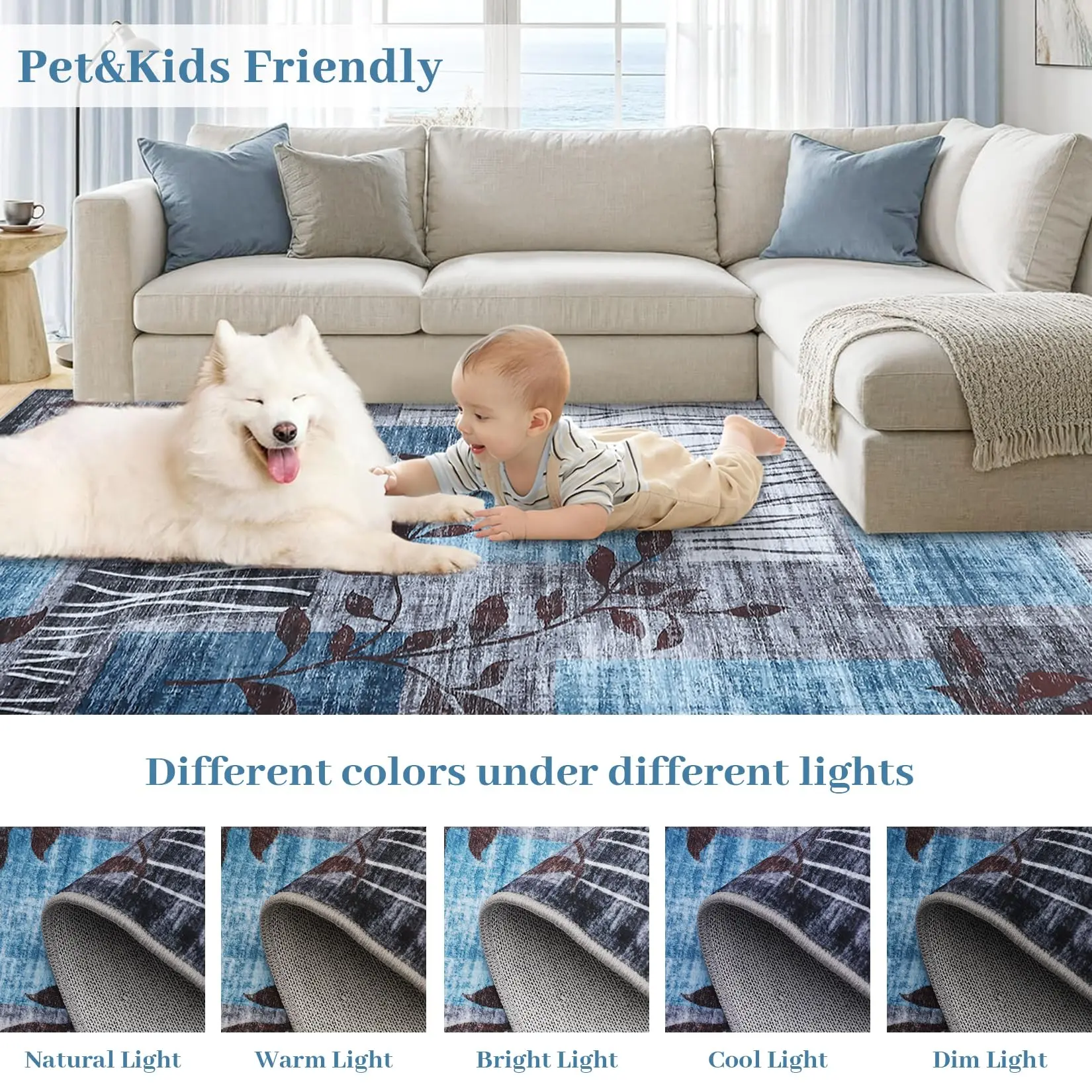 · 【Ultra Soft & Non-Slip Rug】- With fuzzy faux wool velvet, this cozy rug is providing you with softness and comfort; Keep your feet away from the icy floor in the cold winter and the scorching heat can also bring you a silky cool feeling. It's really nice to walk, sit or lay on these super soft area rugs. The non-slip rubber backing offers a steadfast grip, ensuring your rug remains in its designated spot, which is safe for everyday indoor high traffic area from kid or pet activity