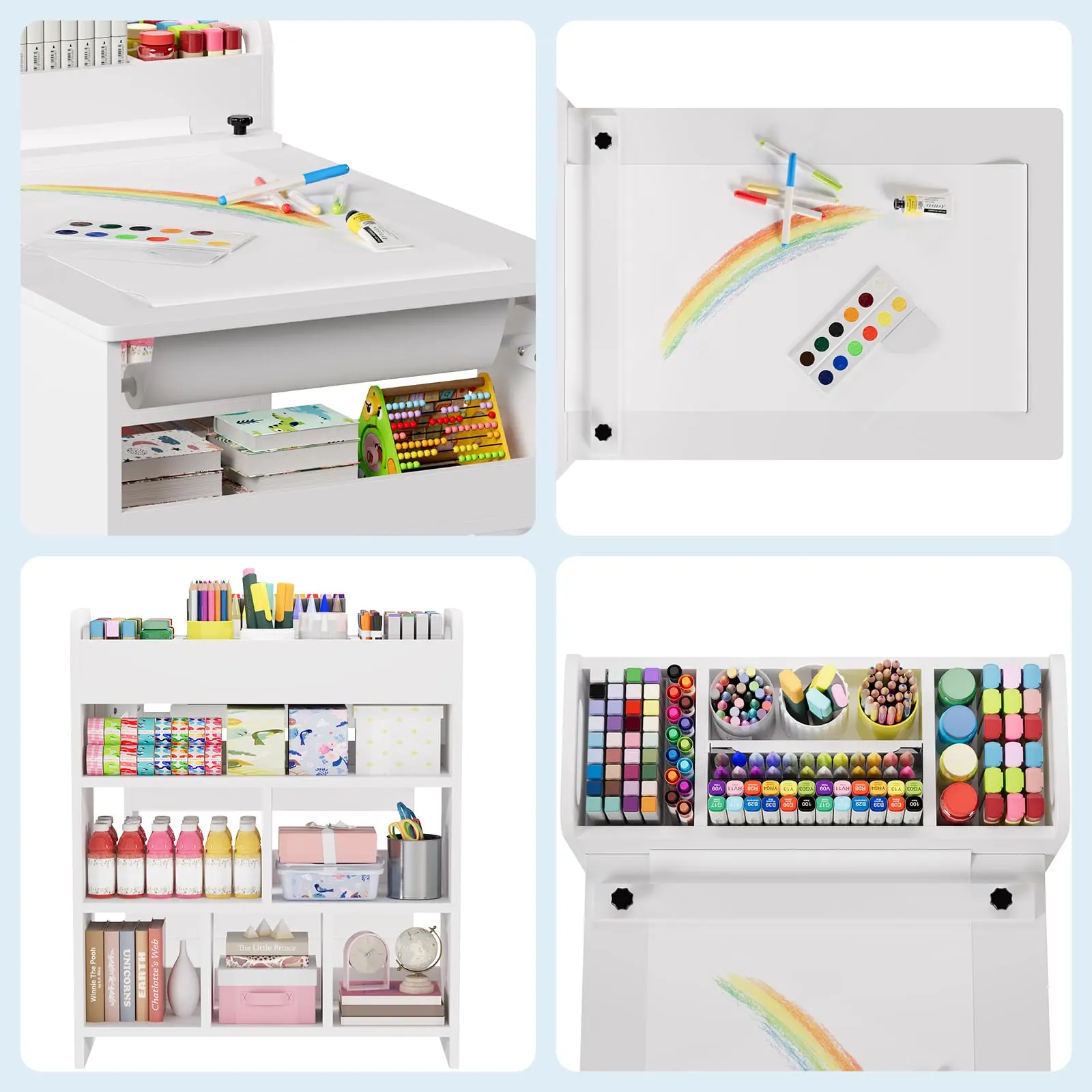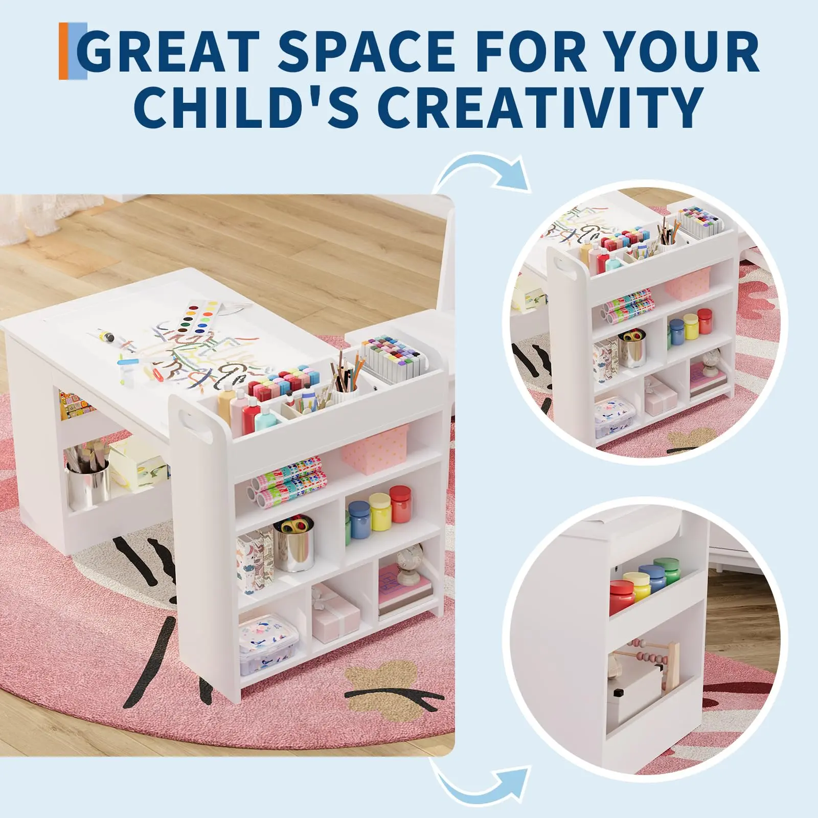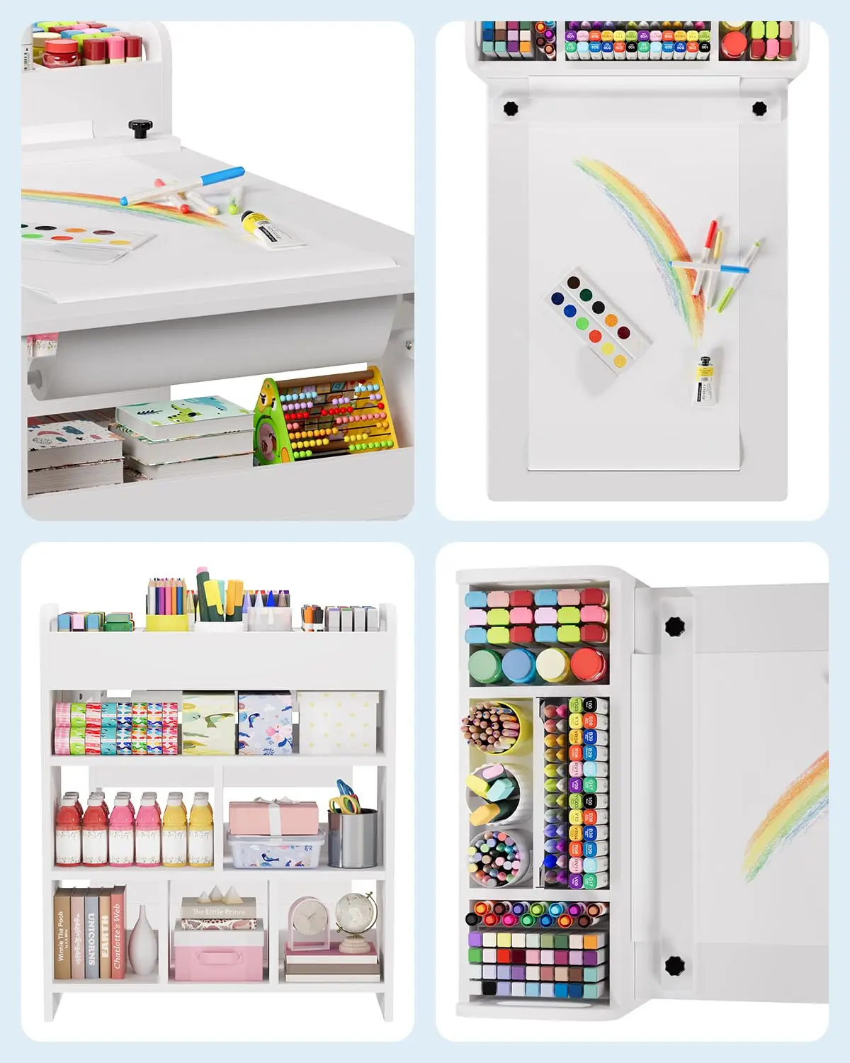 · Ample Storage for Kids' Things: With spacious open storage on both sides, this art table lets kids easily organize their favorite books, art things, and toys. Everything stays neatly and easily accessible, encouraging tidiness and fostering independence