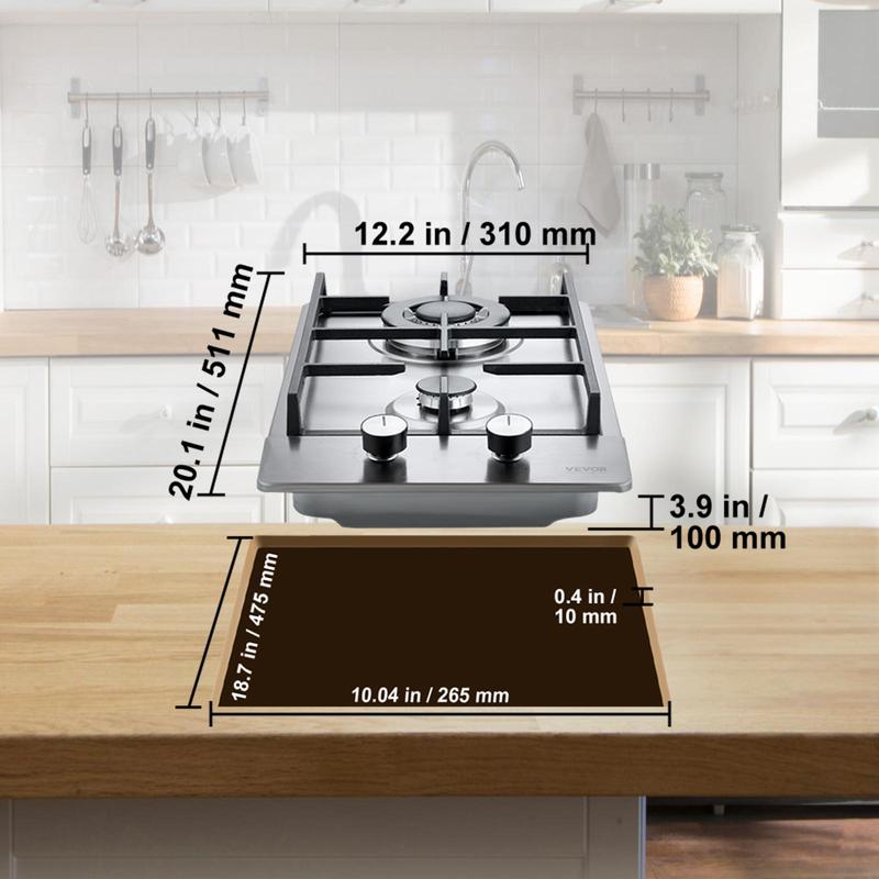 • Highly Efficient Heating: VEVOR 12" built-in gas cooktop features 2 burners with different power levels: 3750BTU and 12250BTU. 12250BTU maximum power and 52% higher thermal efficiency ensure efficient and fast heating. Whether you are simmering or boiling, you can quickly complete your cooking with even heat distribution, and enjoy a delightful cooking experience.