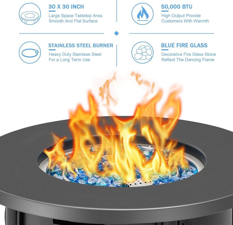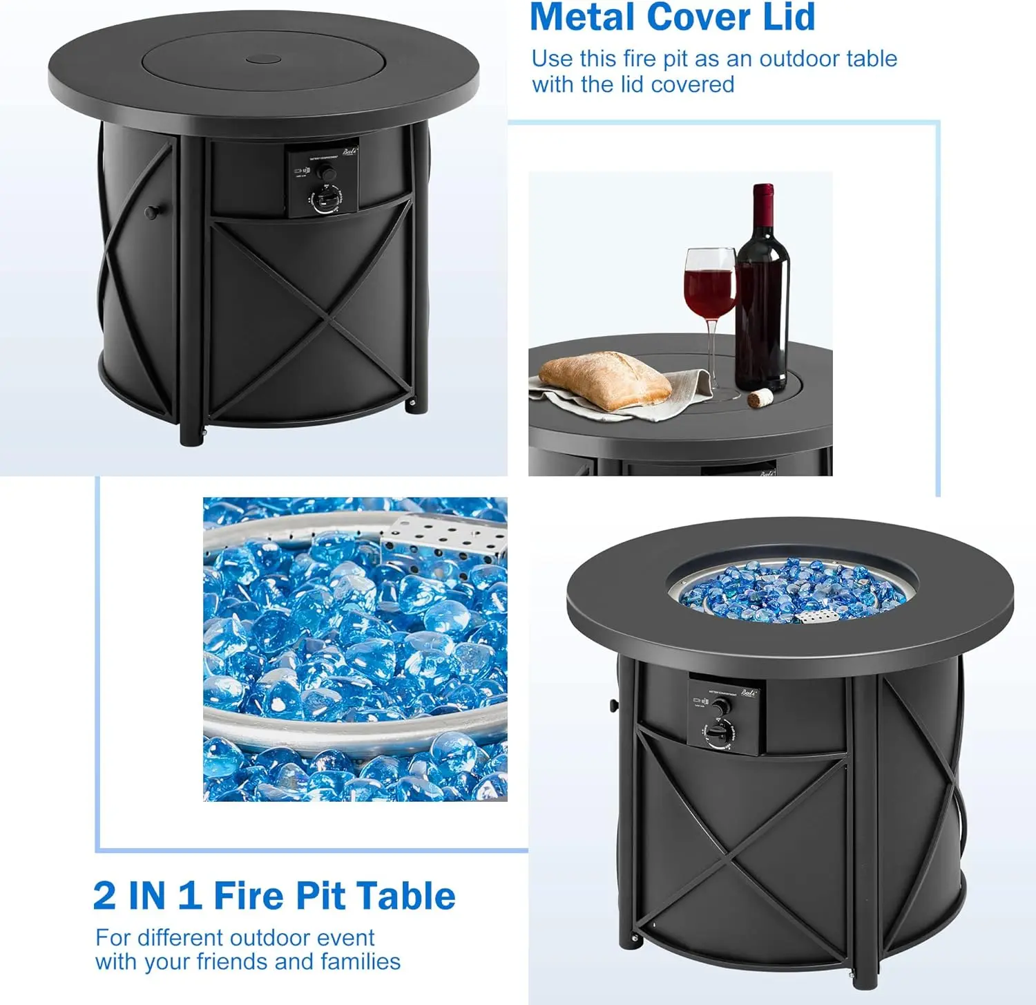 30 x 30 Inch Round Gas Fire Pit Table: With the metal lid, this fire pit converts into a spacious round outdoor table, perfect for conversations when sitting with friends or family in your garden.