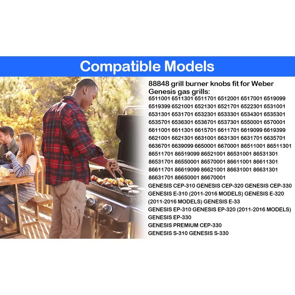 [Replacement Grill Knobs]88848 Grill Burner Knobs replacement suitable for grill with part number 88848, check the part number before purchase, it will be not fit if your part number different[Burner Knob for]The gas burner knobs Compatible with E-310 (2011-2013 MODELS) E-320 (2011-2013 MODELS) E-330-310-320 (2011-2013 MODELS)-330 PREMIUM CEP-330 S-310 S-330 etc[88848 Gas Grill Burner]88848 Grill Burner Knobs made of heat-resistant hard, finish, high quality to ensure enough for long time usage[to install]The 88848 gas grill burner knob to install without any tools, just remove the old one by pulling it straight off its post and replace with a[Customer Service]We are confidient with our product. If you have any questions about our burner knobs, feel free to contact us and we will quickly resolve your issues within 24 hours