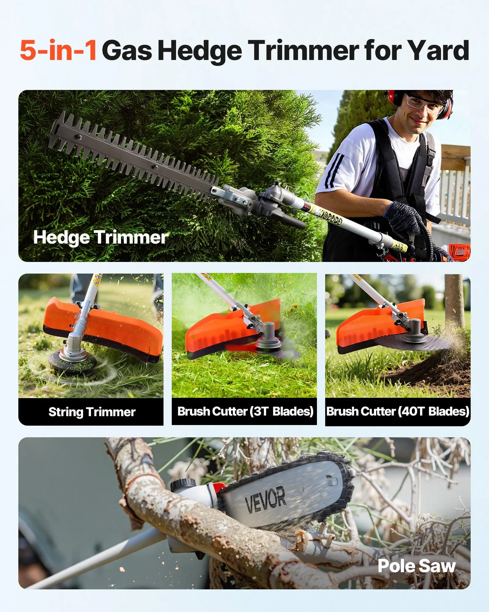 ·5-in-1 Multi-Function: Our gas hedge trimmer includes hedge trimmer, string trimmer, brush cutter (3T & 40T blades) and pole saw, covering all yard tasks such as lawn edging, thick branch cutting, and high hedge trimming