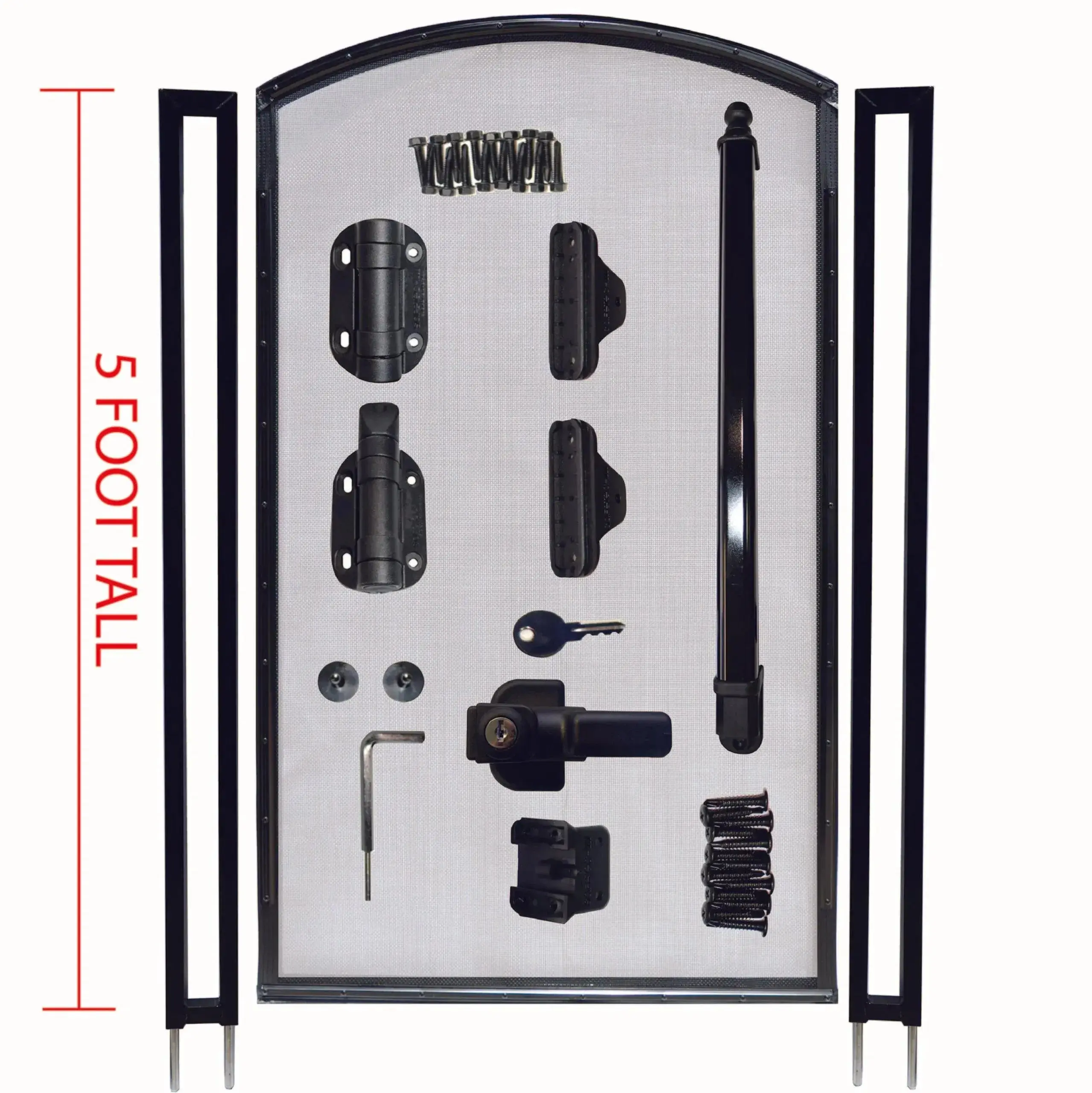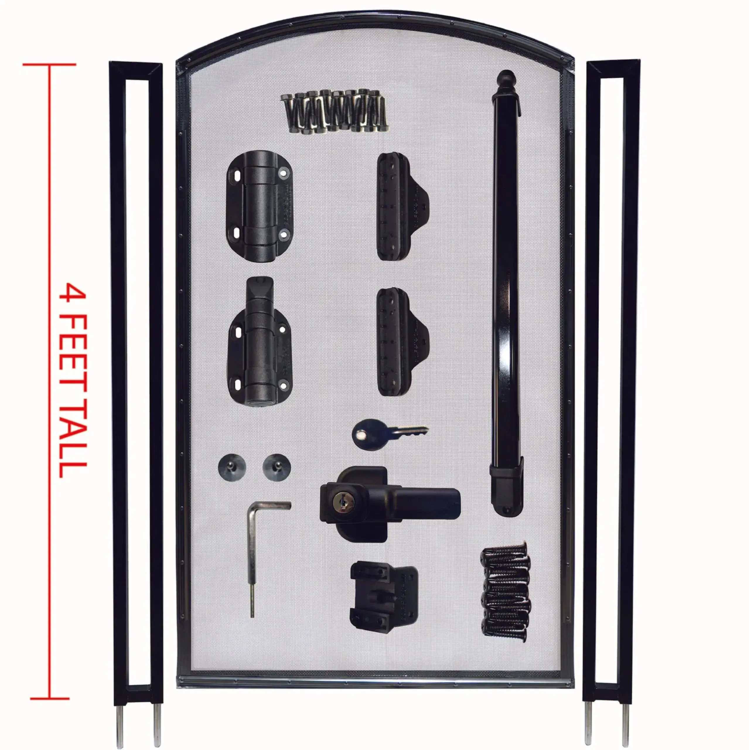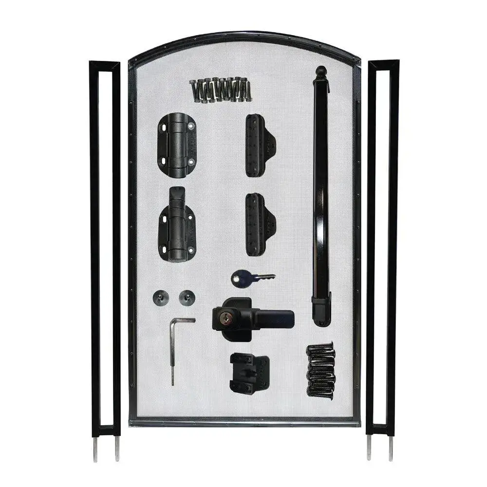 We purchased the arched gate and it works well. Installation was a bit tricky to get the spacing of the holes correct while also angling the drill bit inward.