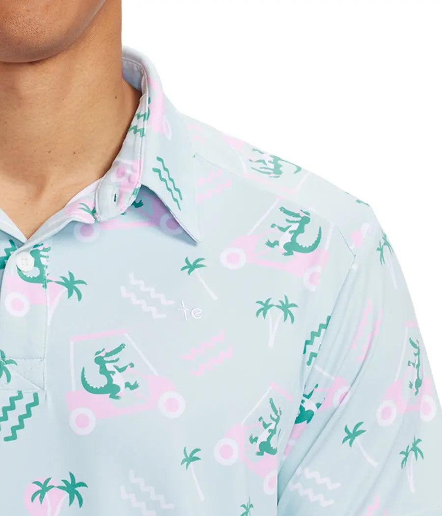 Put a little bite into your wardrobe with this Men's Golf Cart Gator Polo Shirt. This stylish gator polo is super soft with 4-way stretch and wrinkle-resistant fabric for a performance cut you won't soon forget.