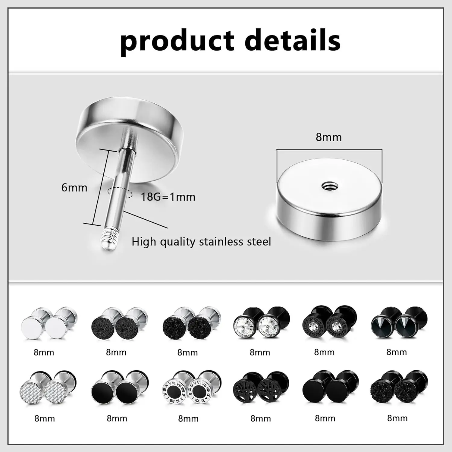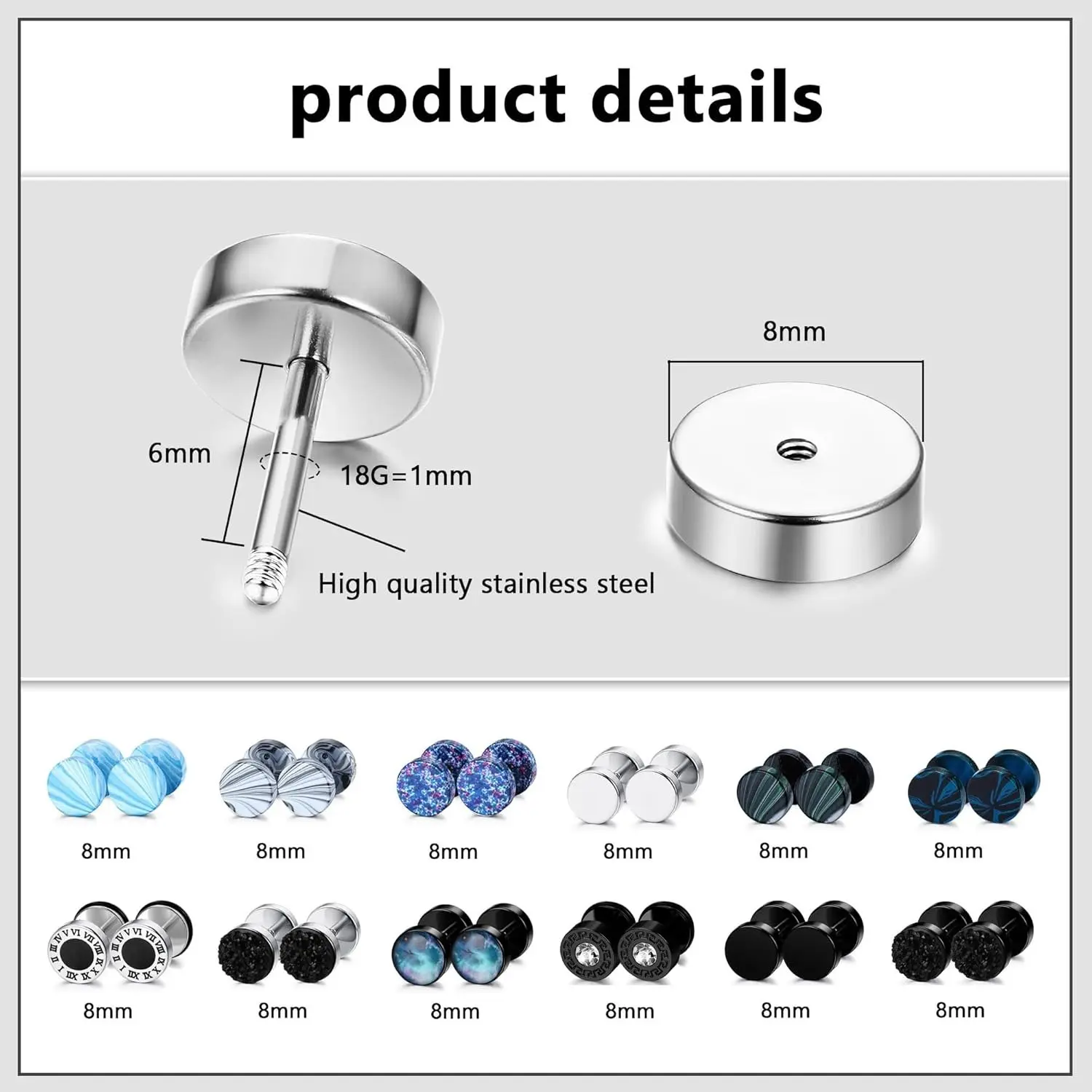 Gauge: 18g(1.0mm), inner diameter 5/16" (8mm), wearable bar length is 6mm