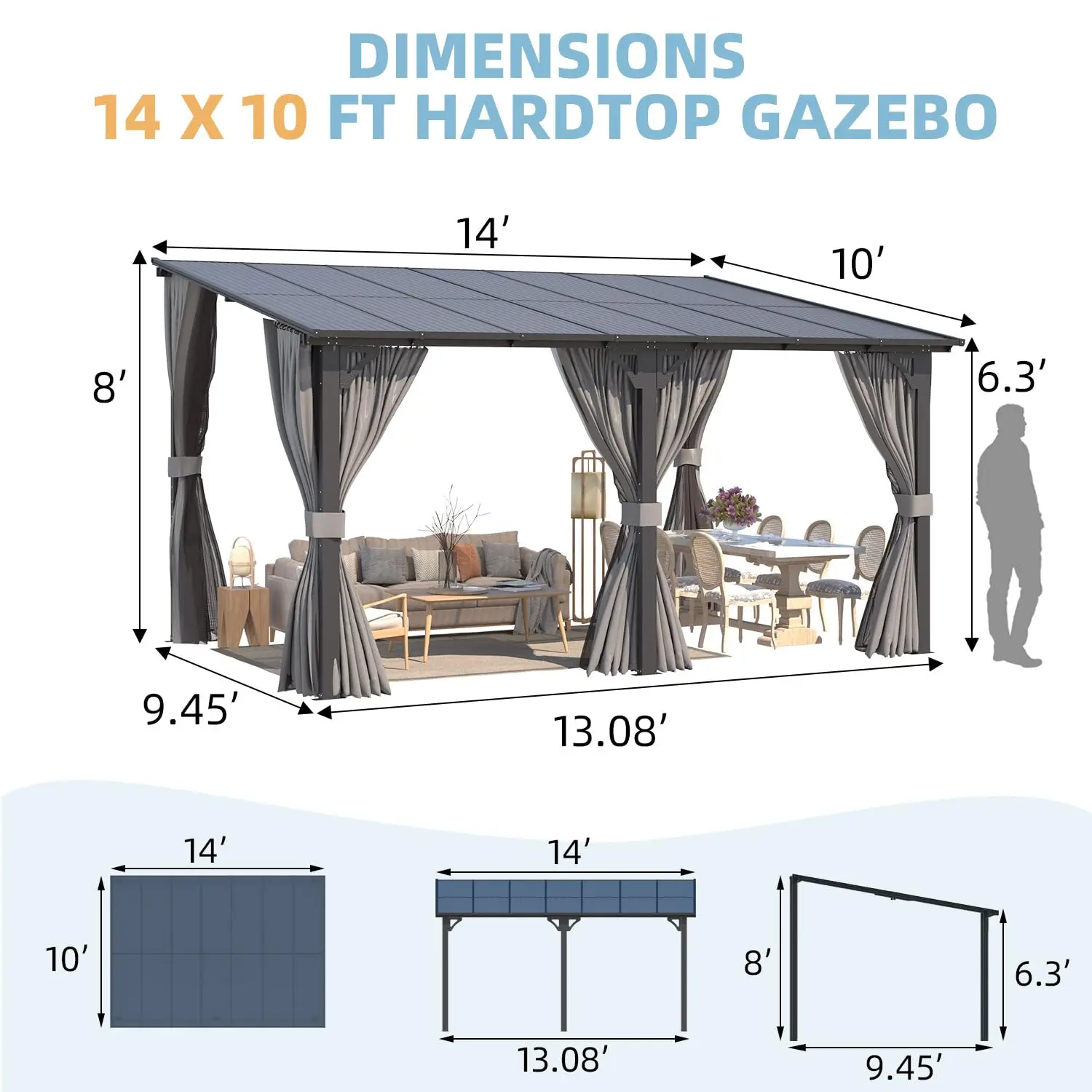 ·Premium Roof: The gazebo roof features high-quality flexible panels, which block 99% of UV rays with UPF 70+ in the summer. In winter, the roof can withstand up to 7 inches of snow, with a pressure tolerance of approximately 6 lbs per square foot, ensuring year-round durability.