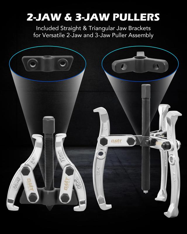 ·2-Jaw & 3-Jaw Pullers: This pulley puller kit comes with straight and triangular jaw brackets for 2-jaw and 3-jaw puller assemblies. Simply grab your wrench or ratchet, and tackle gear, bearing, pulley, and flywheel pulling tasks hassle-free.