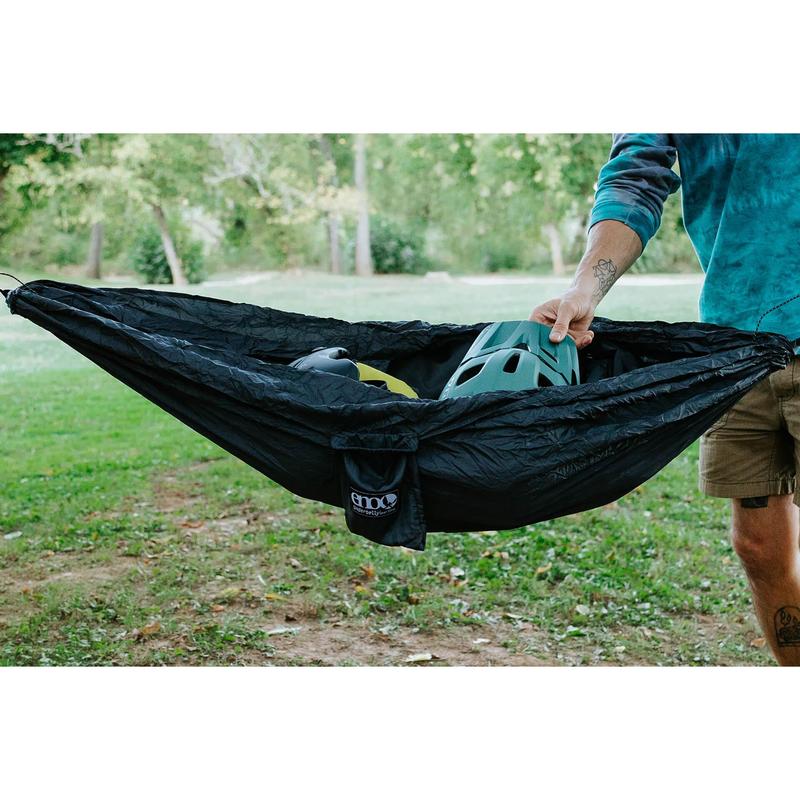 When paired with the eno nomad hammock stand it doesn’t work very well because of the little amount of room between you and the ground hope to find other ways to use this tho.