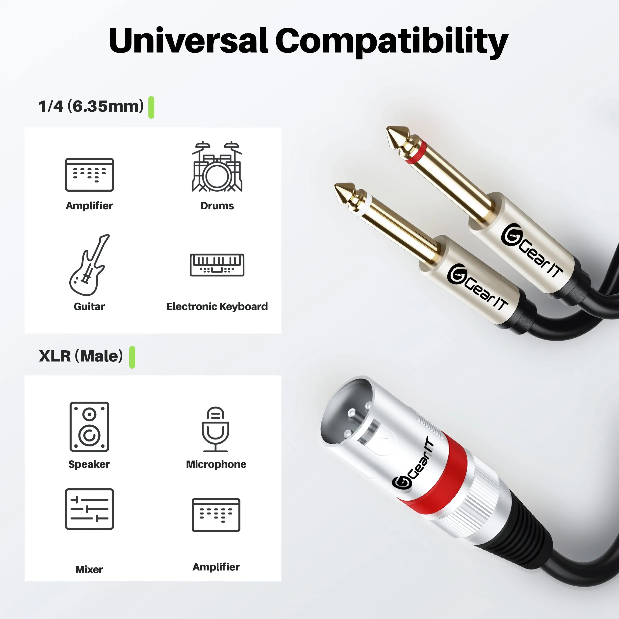 Ever struggled with messy cables during gigs or recording sessions? The GEARit XLR Male to Dual 1/4 inch Y-Cable is here to simplify your setup. Crafted with oxygen-free copper conductors and spiral braided shielding, it delivers superior sound quality by cutting interference and noise. At 10 feet long, it gives you the freedom to connect your guitar, bass, mixer, or amps without feeling tethered. The heavy-duty metal connectors with molded strain relief ensure this cable stands up to the wear and tear of frequent use. Whether you’re jamming live, recording in your home studio, or connecting to your PC, this versatile splitter adapter handles it all smoothly. Inside the box, you get a single 10-foot XLR to dual 1/4 inch cable ready to plug and play. Upgrade your audio gear with a cable that’s built tough and sounds great—grab yours today and enjoy hassle-free connections wherever your music takes you!