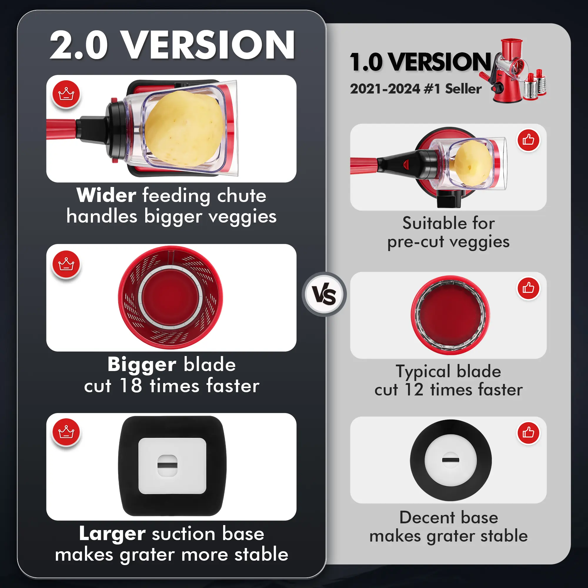 Works really well. It sticks to the countertop and the suction is pretty good. I was able to grate vegetables in less than 2 mins. Awesome. Wish it could be a little bigger though. So easy to use and clean.