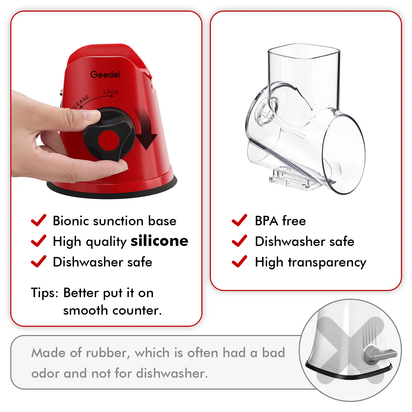 The suction cup on the cheese grater doesn’t stick to my counter, table, or even my glass cutting board. It won’t stay in place at all, so it’s basically impossible to grate cheese without it tipping over.