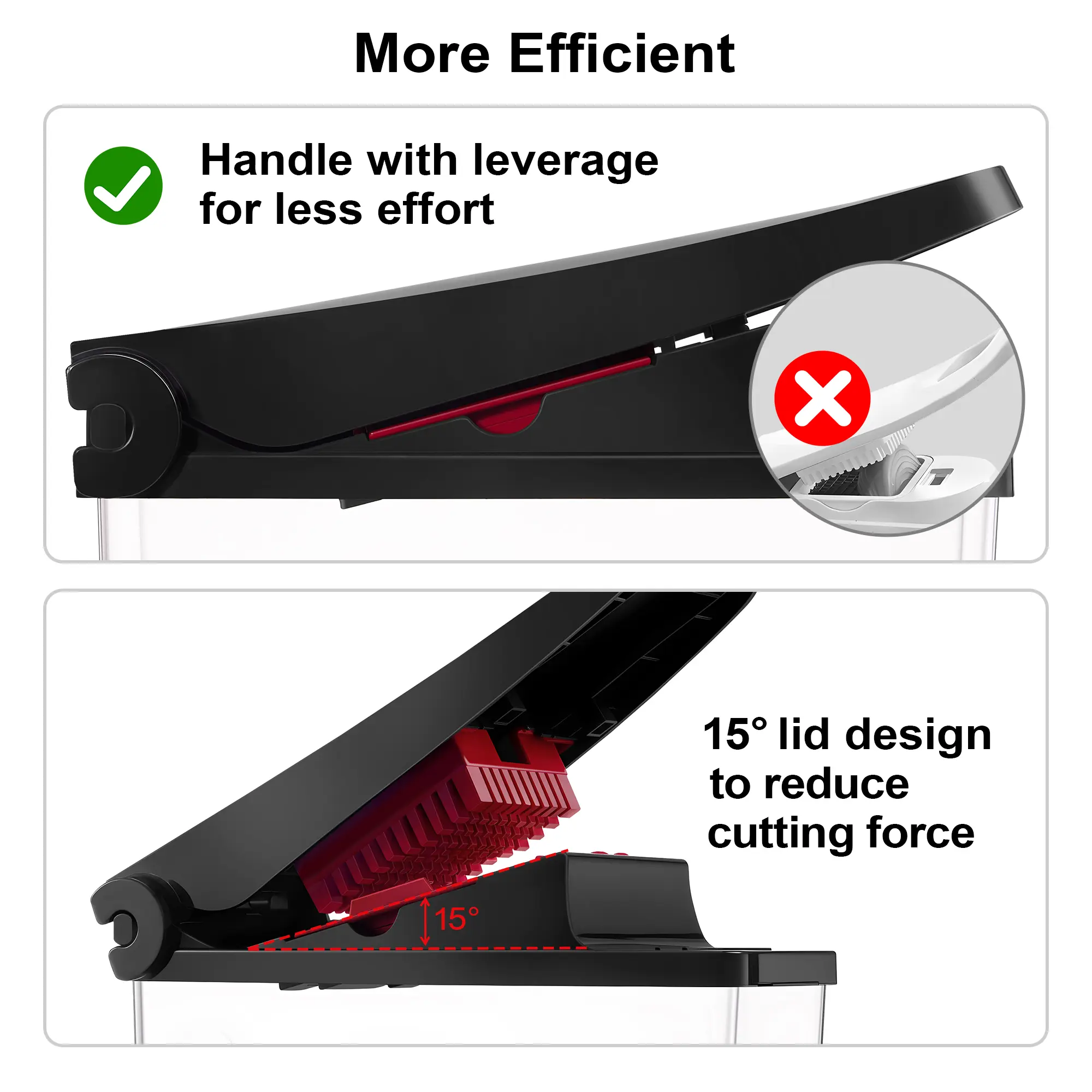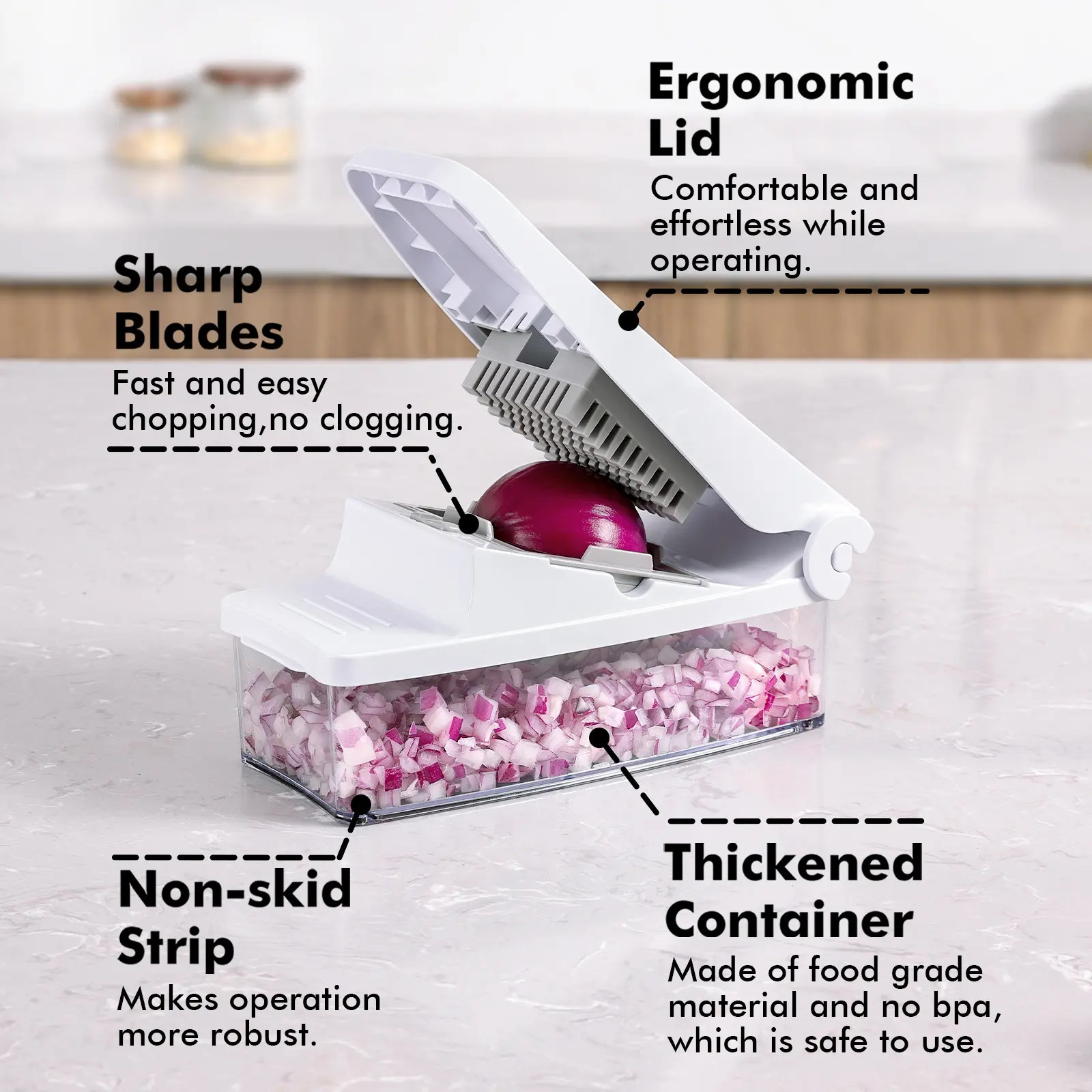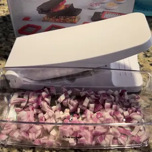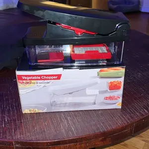 There was a bad smell like moth balls in the product box. The most disappointing part was it broke on my first use chopping a sliced onion. A blade popped out and you can’t slide it back in. The plastic broke.