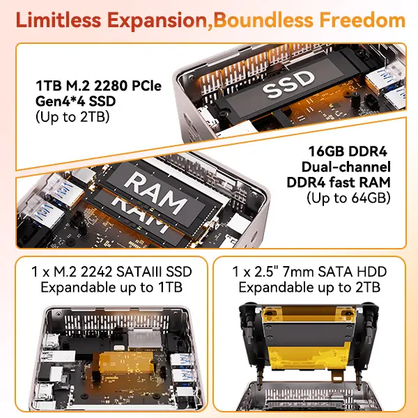 [16GB RAM 512GB SSD, Upgrade Friendly] The GEEKOM A5 features 16GB dual-channel DDR4 RAM and 512GB PCIe 3.0x4 NVMe SSD