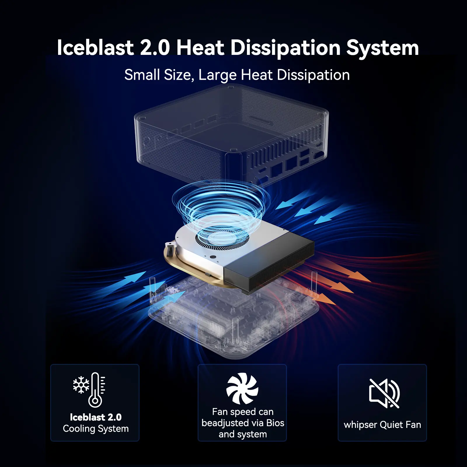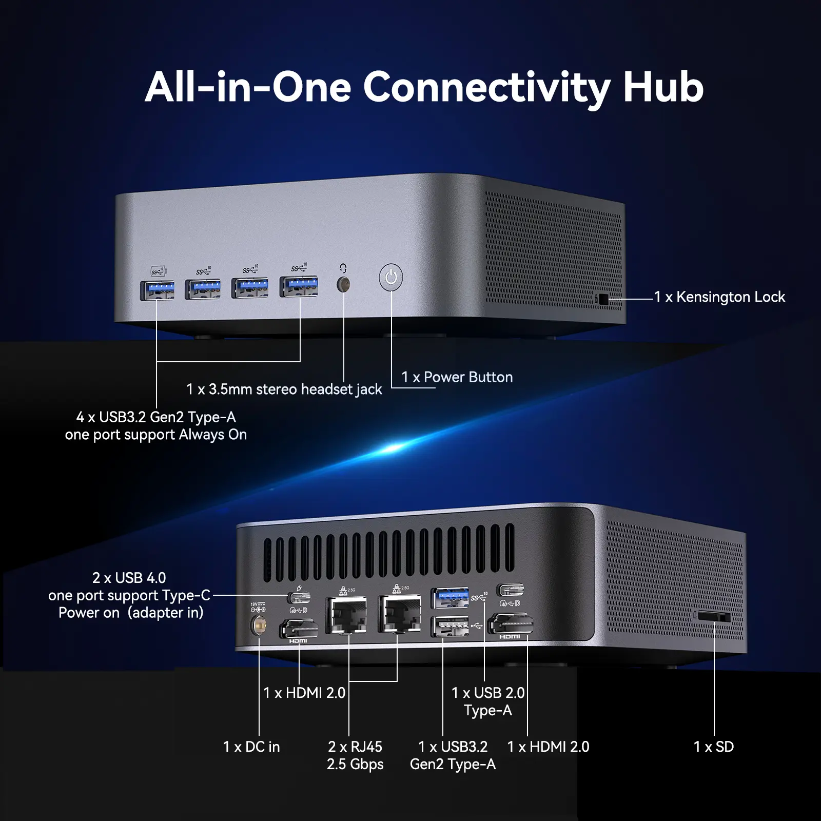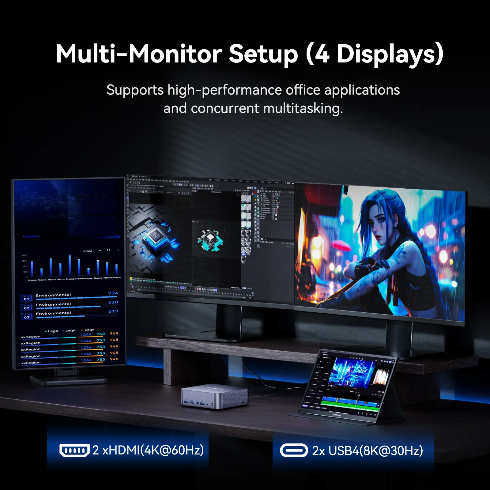 The GT1 Mega mini PC offers 2 USB4.0 ports (40Gbps, 8K@30Hz) and 2 HDMI 2.0 ports (4K@60Hz). It supports up to four simultaneous displays—two 8K and two 4K. This makes it perfect for gaming, video editing, and entertainment, providing stunning visuals.