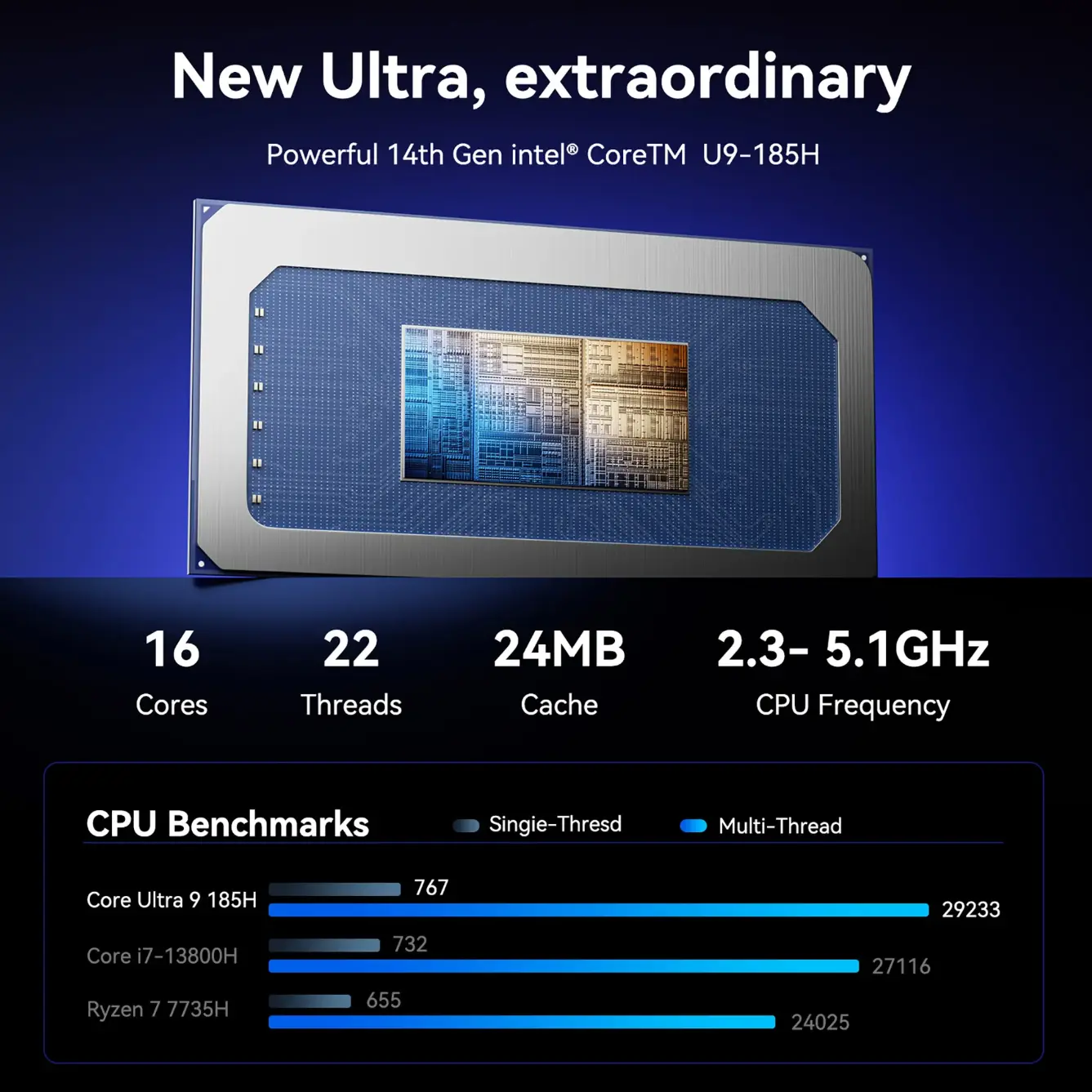 The GEEKOM GT1 Mega mini PC is powered by a 14th Gen Intel Core Ultra U9-185H processor with 16 cores and up to 5.1GHz. It delivers energy-efficient, high-performance computing for heavy workloads and multitasking. This ensures smooth operation for gaming, office, streaming, and creative work. The processor's capabilities make it ideal for demanding tasks without compromising on power.
