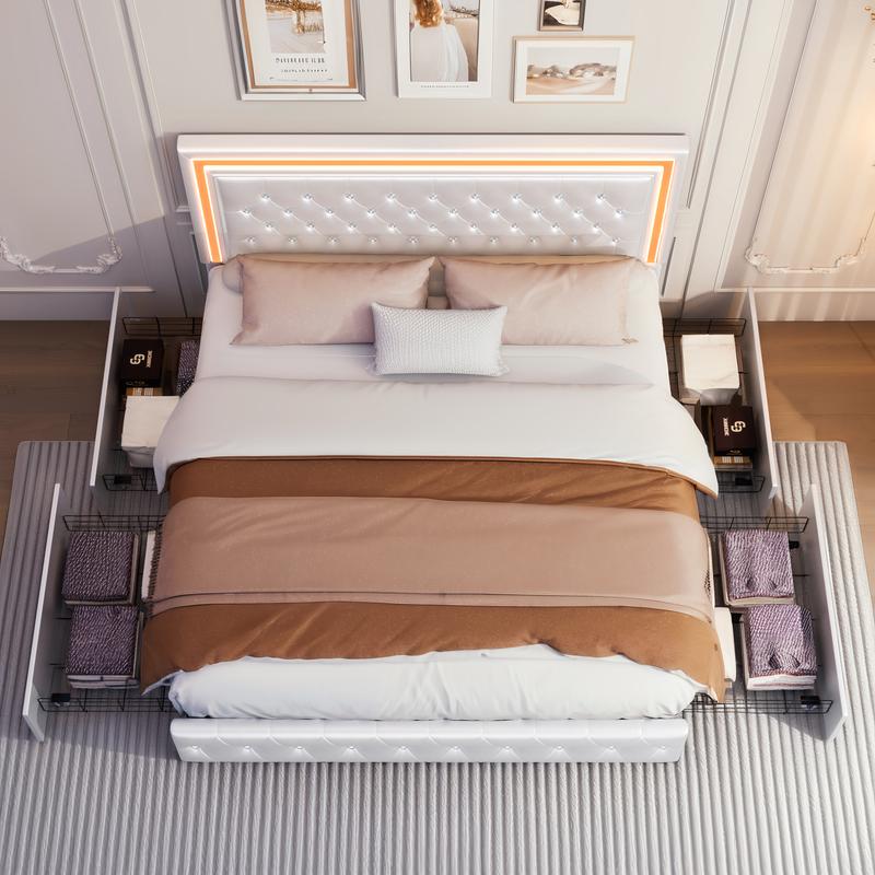 Hidden Storage Drawers: Four smooth-glide drawers under the bed provide generous hidden storage for clothes, blankets, seasonal items, or daily essentials—ideal for keeping bedrooms organized in apartments or busy households.