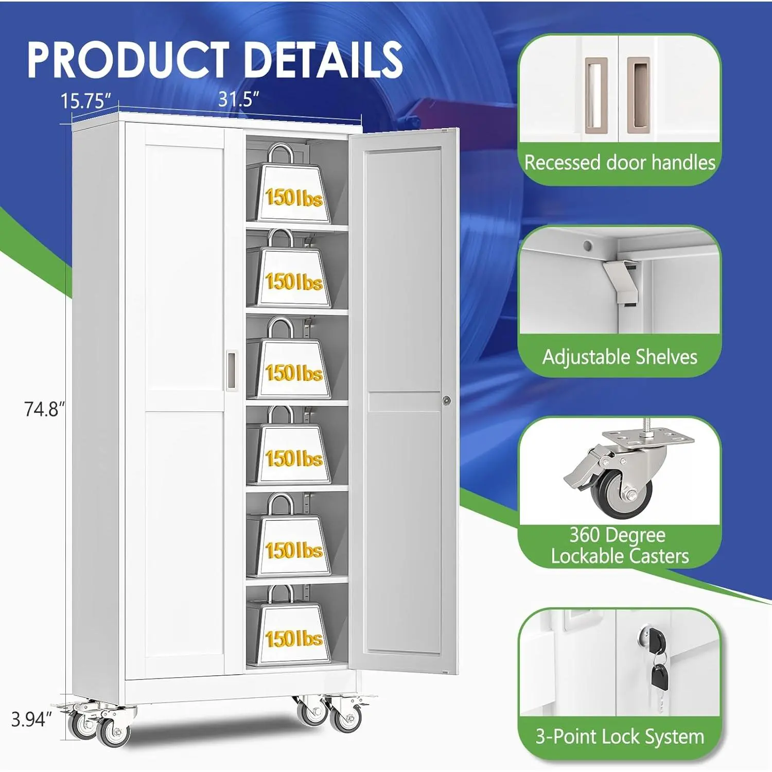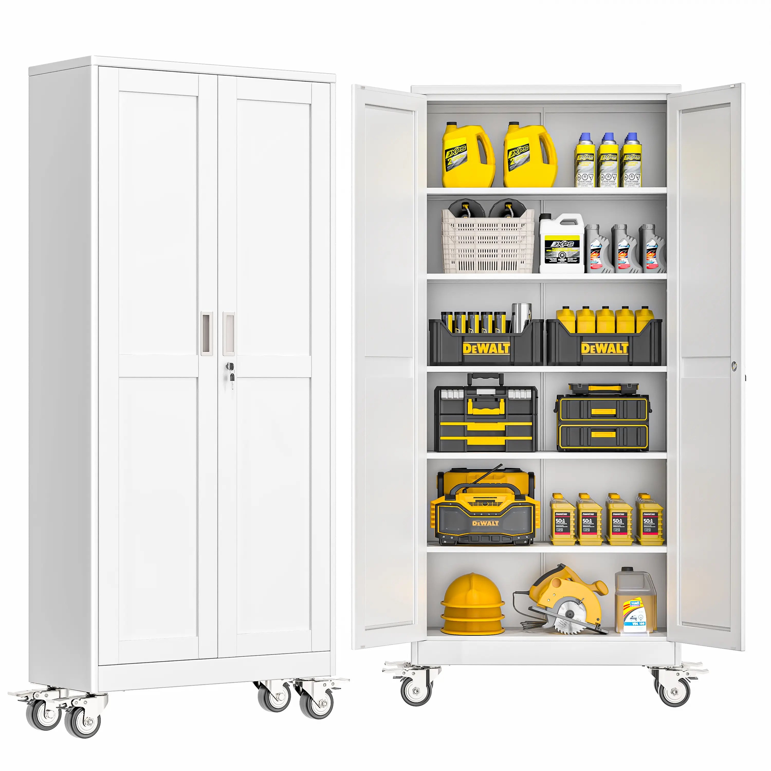·5 Adjustable Shelves for Flexible Storage Needs – This storage cabinet (perfect as a garage storage cabinet) comes with 5 removable and adjustable shelves, letting you customize the internal space to fit items of different sizes – from small hand tools to large power equipment or bulky garage supplies.No more messy piles; keep your space organized effortlessly.