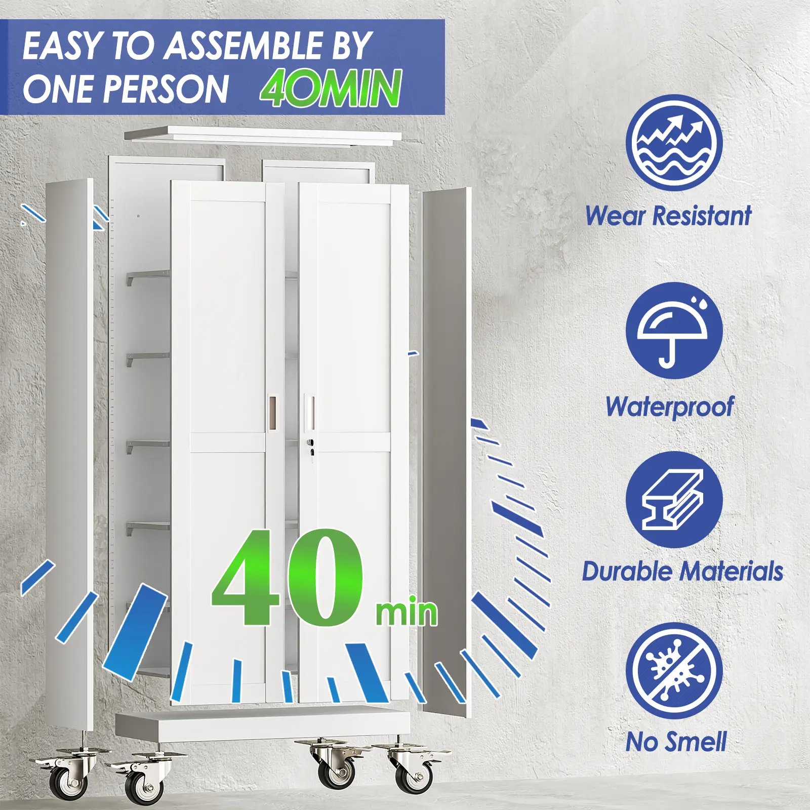 ·360° Swivel Wheels for Effortless Mobility – As a practical rolling cabinet and metal storage cabinet with wheels, this unit features 360-degree rotatable wheels that let you move it smoothly across garages, shops, or home interiors.Whether you need to access tools in different corners or rearrange your space, mobility has never been easier (works great as a portable tool cabinet too!).