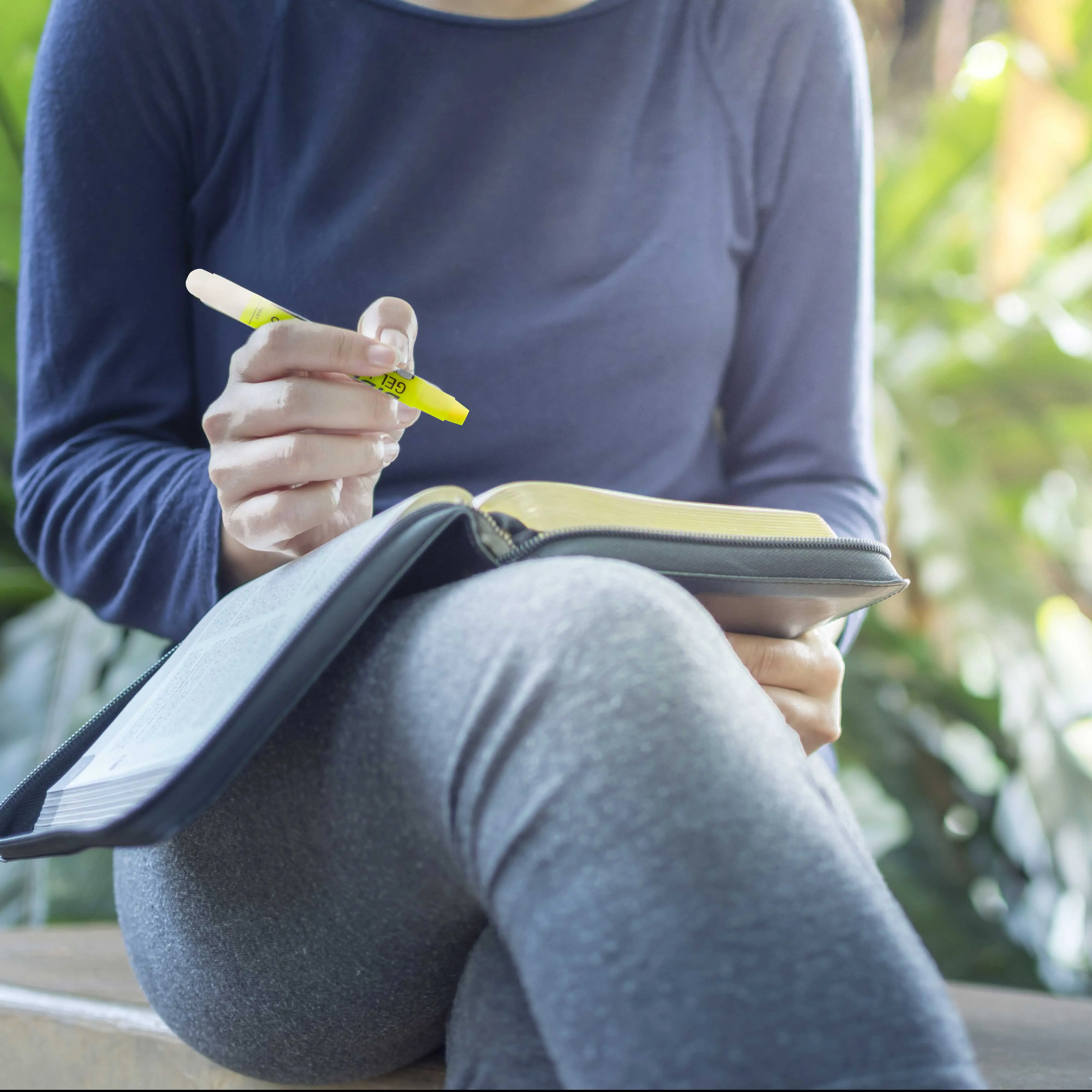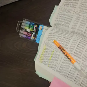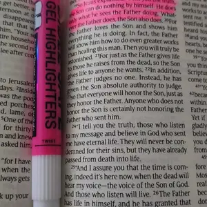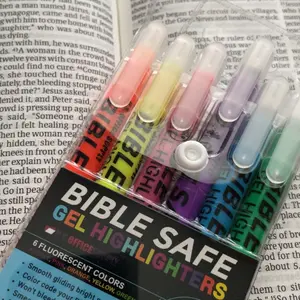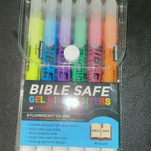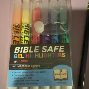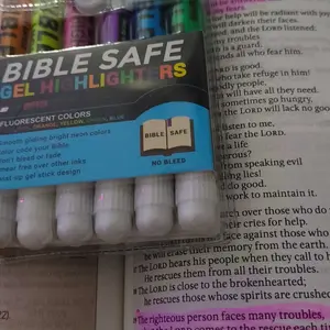 Set of Bible Safe Gel Highlighters in 6 different eye-catching colors of bright neon fluorescent highlight markers. Colors: yellow, pink, purple, blue, green, orange. Archival quality Bible Safe Gel Highlighters that are ideal for color-coding Bibles. Also safe for highlighting on any paper surfaces like study, text, and legal books. Highlight Bibles to emphasize meaningful words, phrases, and passages; Holy spirit, prayers and blessings; Faith, growth, and wisdom; Love, grace, and salvation. Includes study guide and a storage pouch.