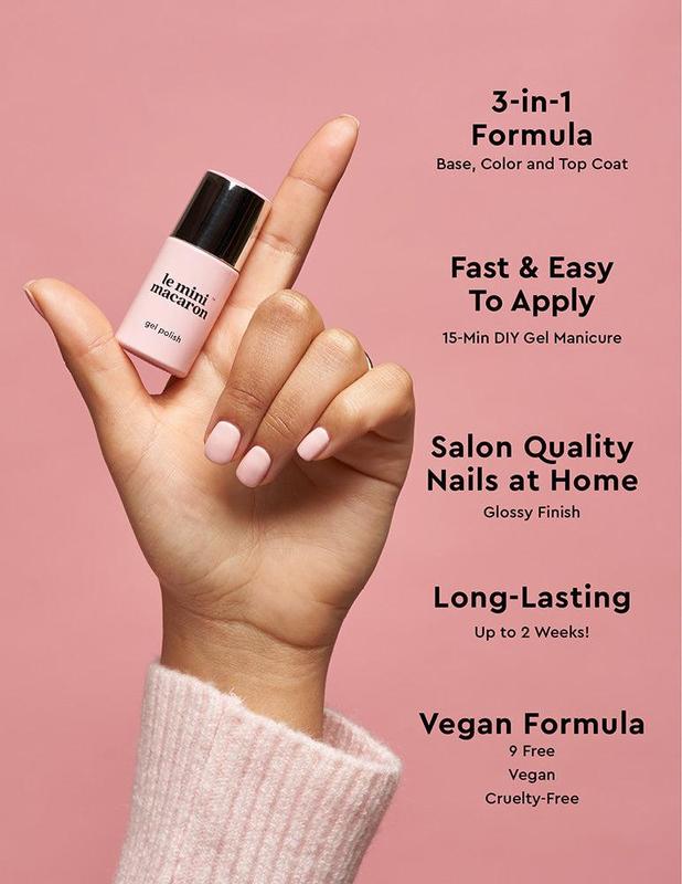 . A translucent shade with iridescent shimmers of white, pink, and lavender. Looks great alone or on top of any gel polish color. Includes everything you need to DIY your gel manicure when and where you want!Our 3-in-1 gel polish combines base coat, color, and top coat all in one bottle! Cures in 30 seconds with the Le Mini Macaron LED lamp.