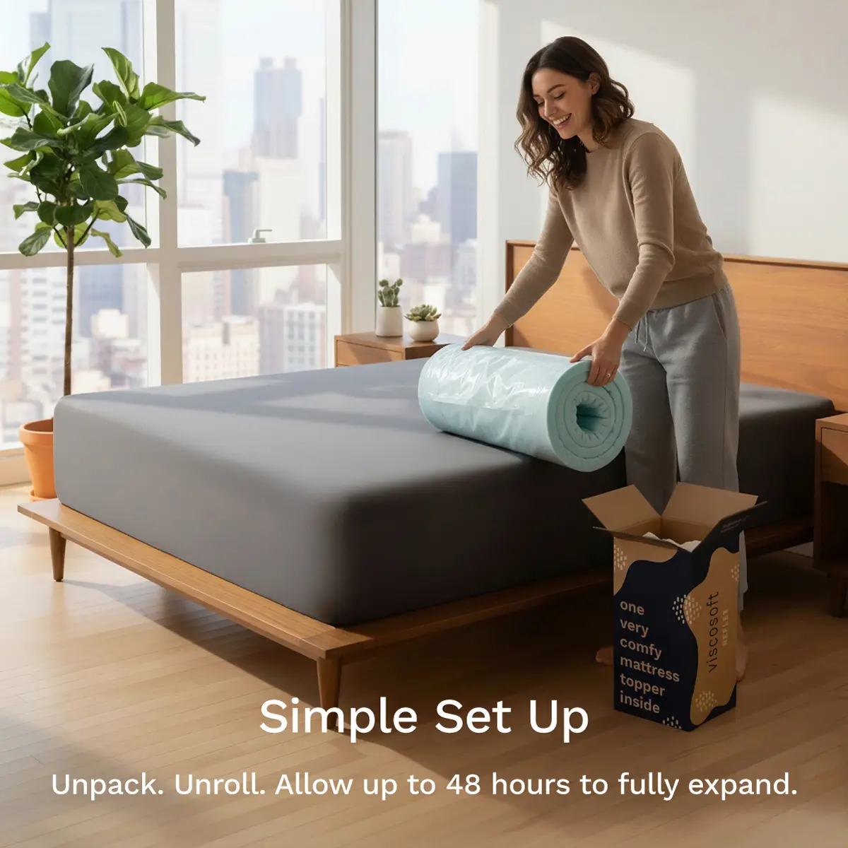 “Estoy fascinada con mi Viscosoft Reflex Topper. 🤍 No solo hizo mi cama mucho más cómoda, sino que además le sumó esos centímetros que necesitaba porque era súper bajita. Ahora se siente suave, esponjosa y perfecta para descansar. ¡Definitivamente valió la pena!”