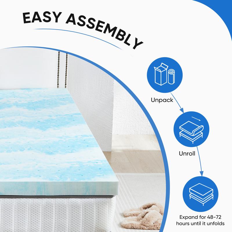 I ordered a twin and a twin xl, both 2 inch, and they came different. Neither or them have a cooling gel but the twin seems to just be regular foam, it rises quicker with less comfort and has a different texture. The twin is shiny and has air throughout and bigger holes. Do not get them.