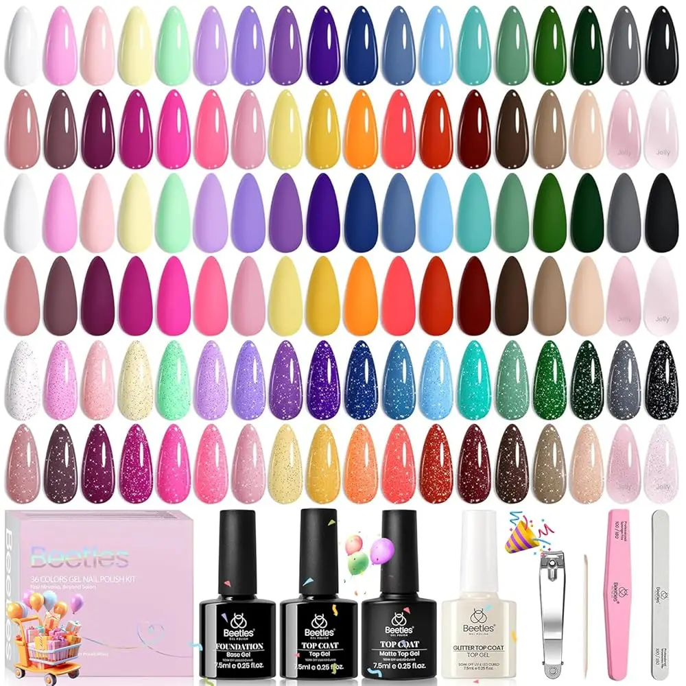 The set includes 5ml36 colors gel nail polish, 7.5ml1 base coat, 7.5ml1 glossy top coat, 7.5ml1 matte top coat, 7.5ml*1 top coat, and other nail tools. Enjoy a worry-free manicure with a formula suitable for both home and salon use.