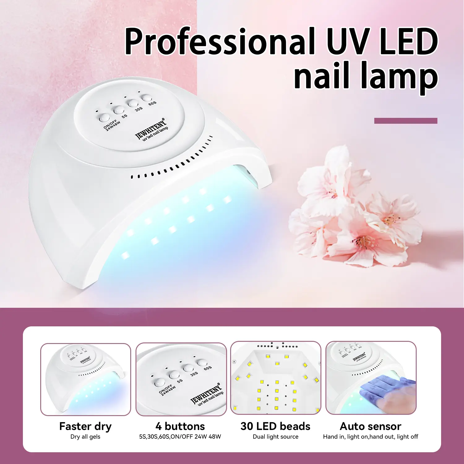 ·High Power Nail Lamp: Ultra-fast drying u v lamp nail gel polish dryer with 4 timer settings 10s/30s/60s/99s low heat. display screen shows the usage time; Auto-sensing function, you only need to put your hand in, the light will automatically glow, release it, the light will automatically go out. High-quality 36 LED lamp beads with optimal beads distribution, easily dries and cures any type of U V/LED gel nail polish.