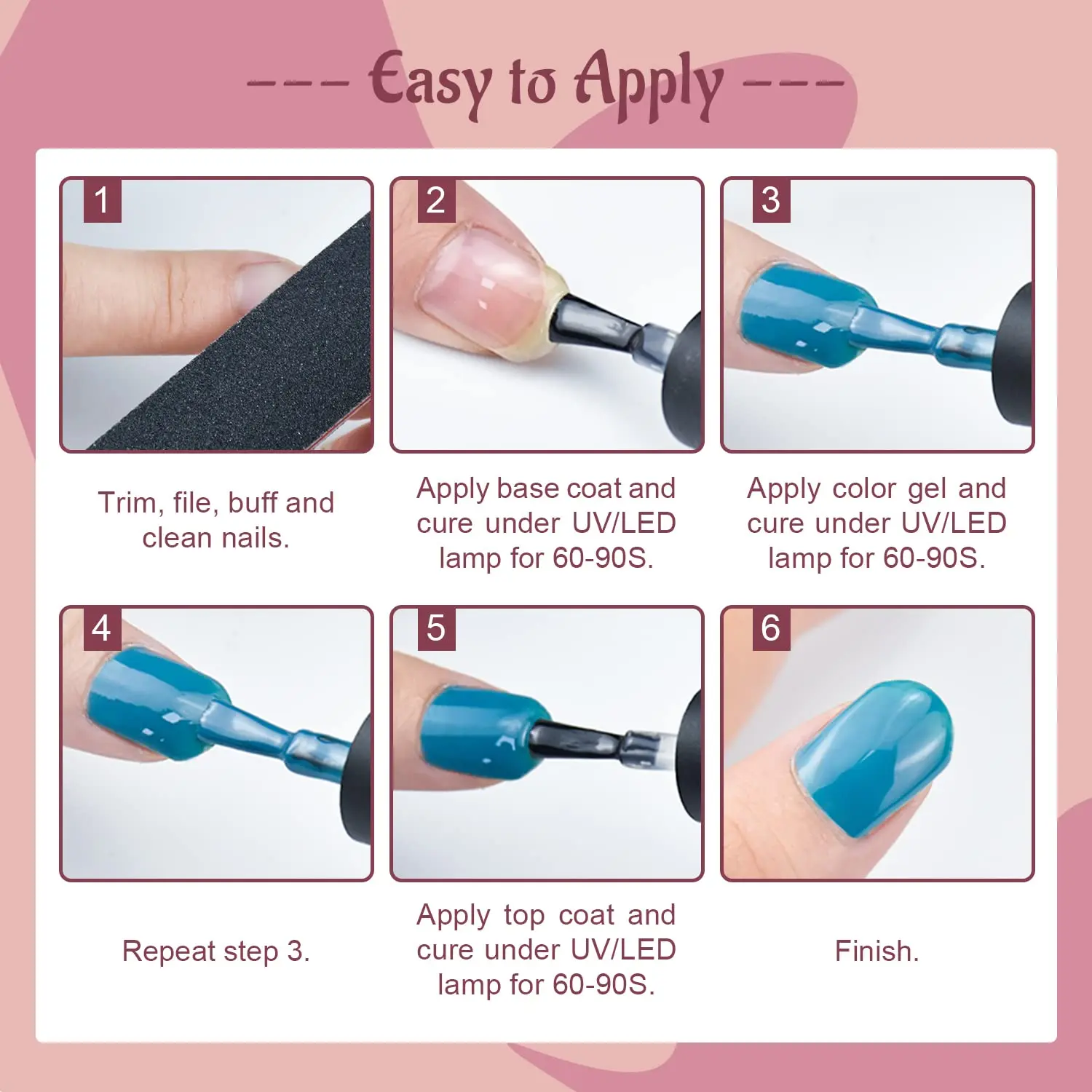 Exactly as advertised! Process was slow because I had to stay under light 3-5 minutes per hand per layer, gonna try thinner layers next time. Still very pleased with results even w/long process. Paid less than one mani w/gel