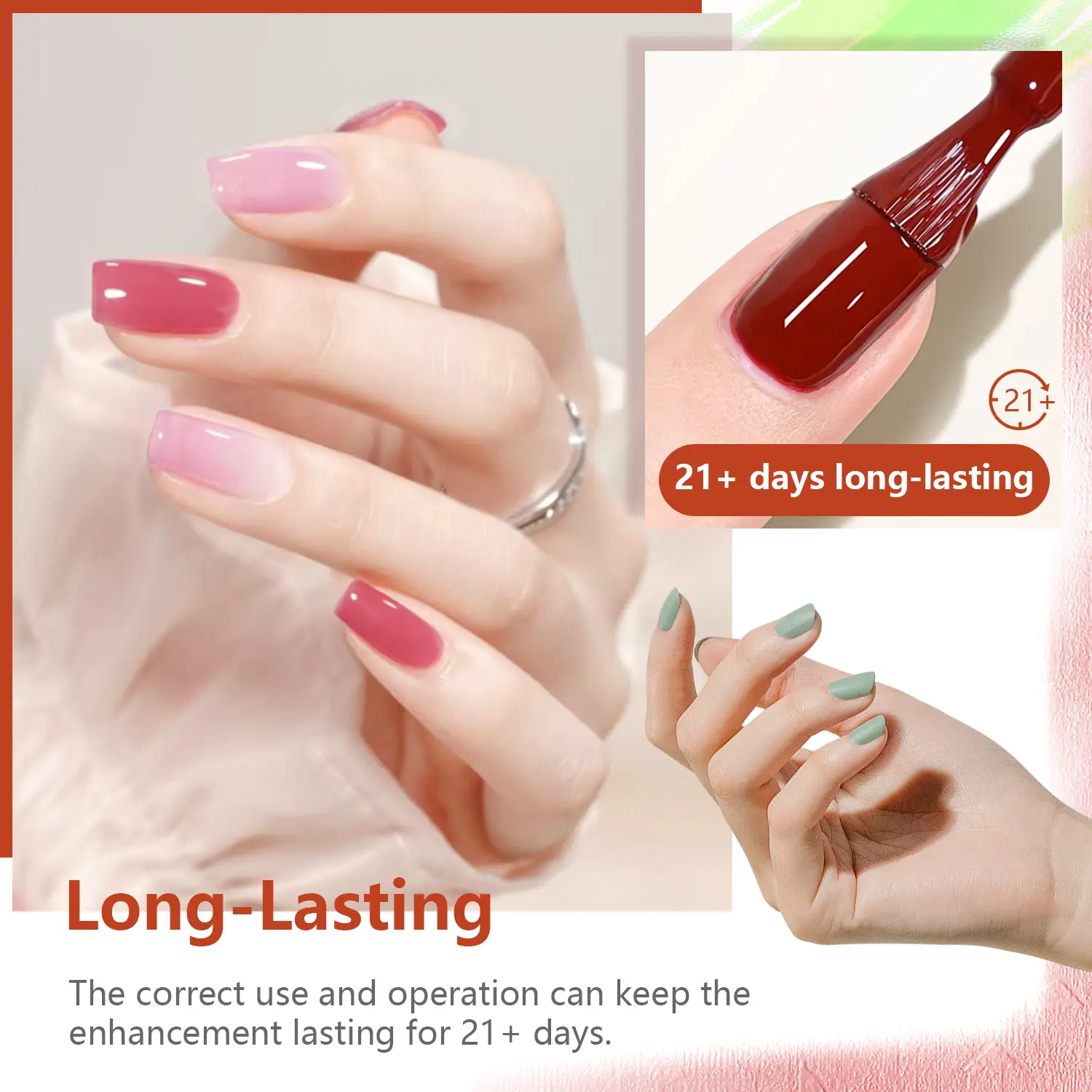·High Shine and Durability: Gel nail polish has colors and high shades, a thin layer can show the color of gel nail polish. Under the curing of the nail lamp, it can stay on the nail for about 21 days and the color is still relatively obvious.