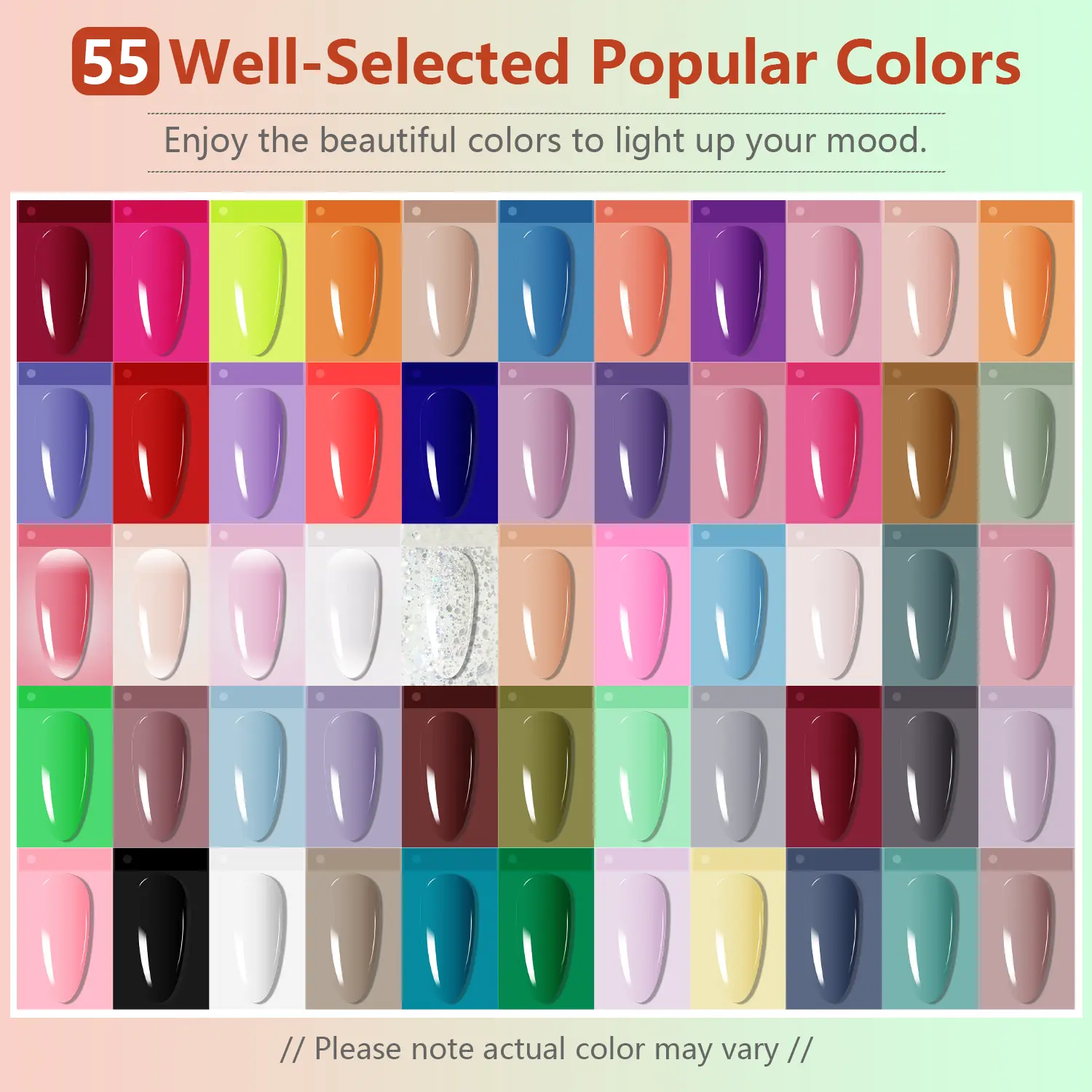 ·Note: Our gel nail polish will show slight color difference under different display and light sources, but this is normal. If you want to get intact gel polish effect, please consult us before purchase.