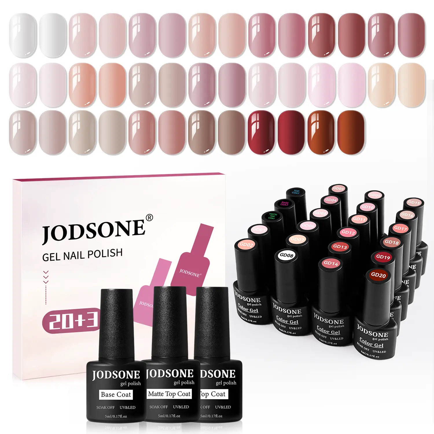 ·Packaging: The image shows the JODSONE gel nail polish set packaging, including the 20 gel bottles and 3 top coat bottles.