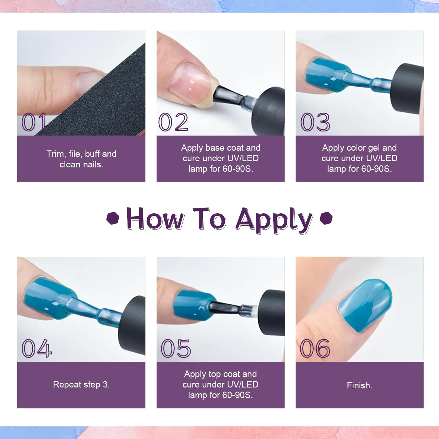 ·Use: Before using gel nail polish, use the nail drill to clean and recuperate the nail surface. After using, cooperate with the nail lamp to achieve a better color fixation effect, which can be retained on the nail for a longer time. Gel nail polish is made of natural resin, health minerals and other ingredients. Tested by professional personnel to effectively ensure product safety. It is very safe to use.