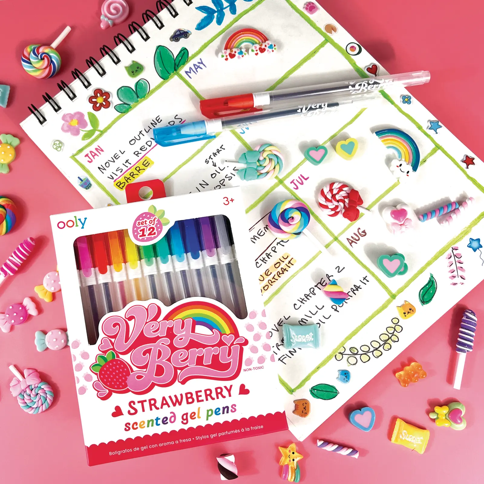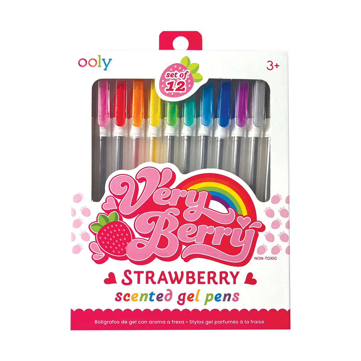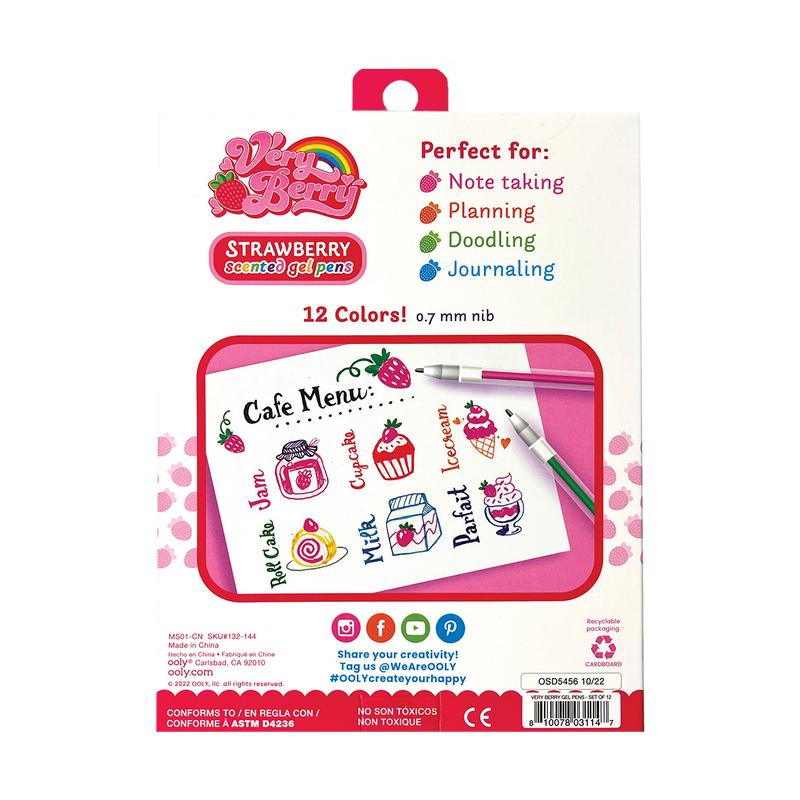 12 different colored gel pens are included in the set, but each one shares that unforgettable strawberry scent!