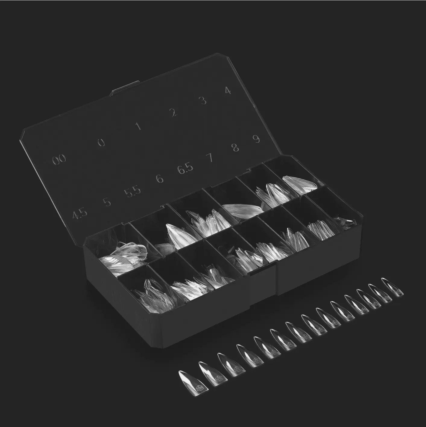 Gel-X offers a natural look with its stiletto shape and long length. Each box includes 4.5, 5.5, and 6.5 sizes, simplifying tip sizing and prep. This design ensures a natural finish with minimal filing.