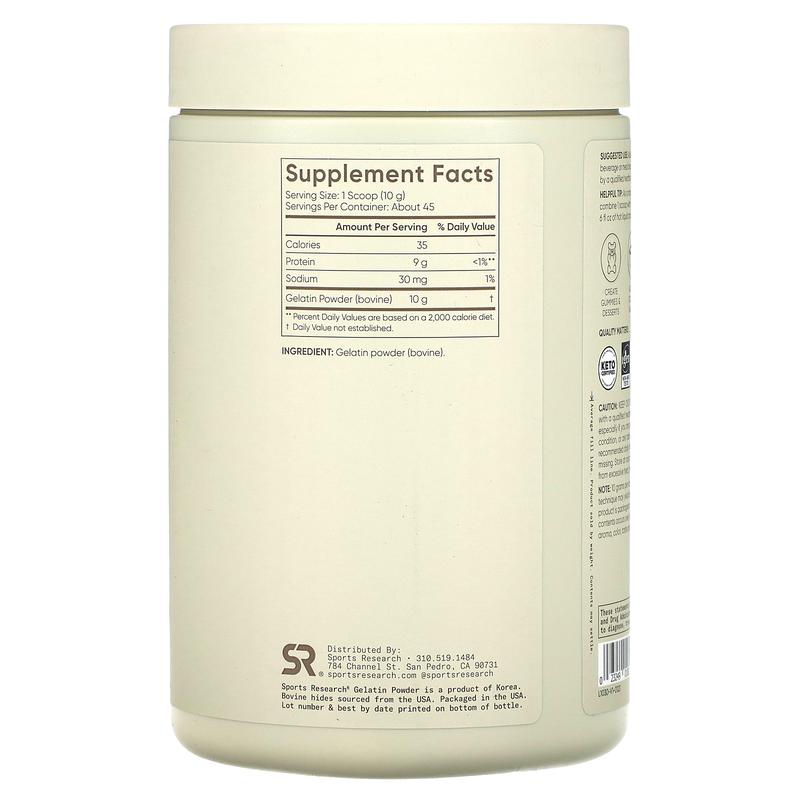 Sports Research Gelatin Powder, Unflavored, 1 lb (454 g)