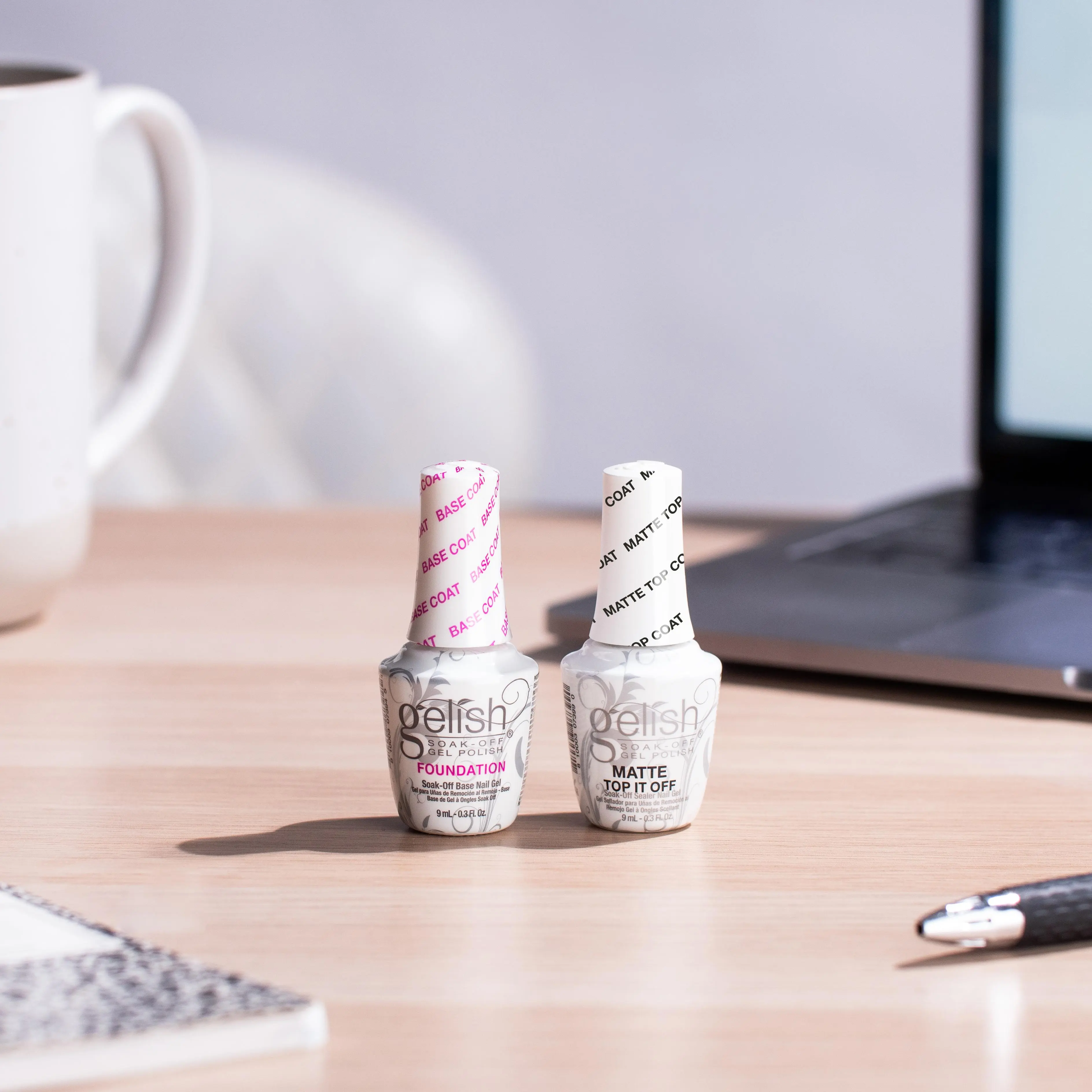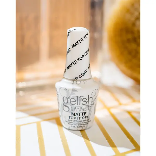 Gelish Matte Top Coat gives your nails a trendy, matte finish. It offers the same durability as the original top coat, adding a sleek, modern look. This compact set delivers professional results anywhere, ensuring a smooth base and trendy matte top coat for a durable, salon-quality manicure.