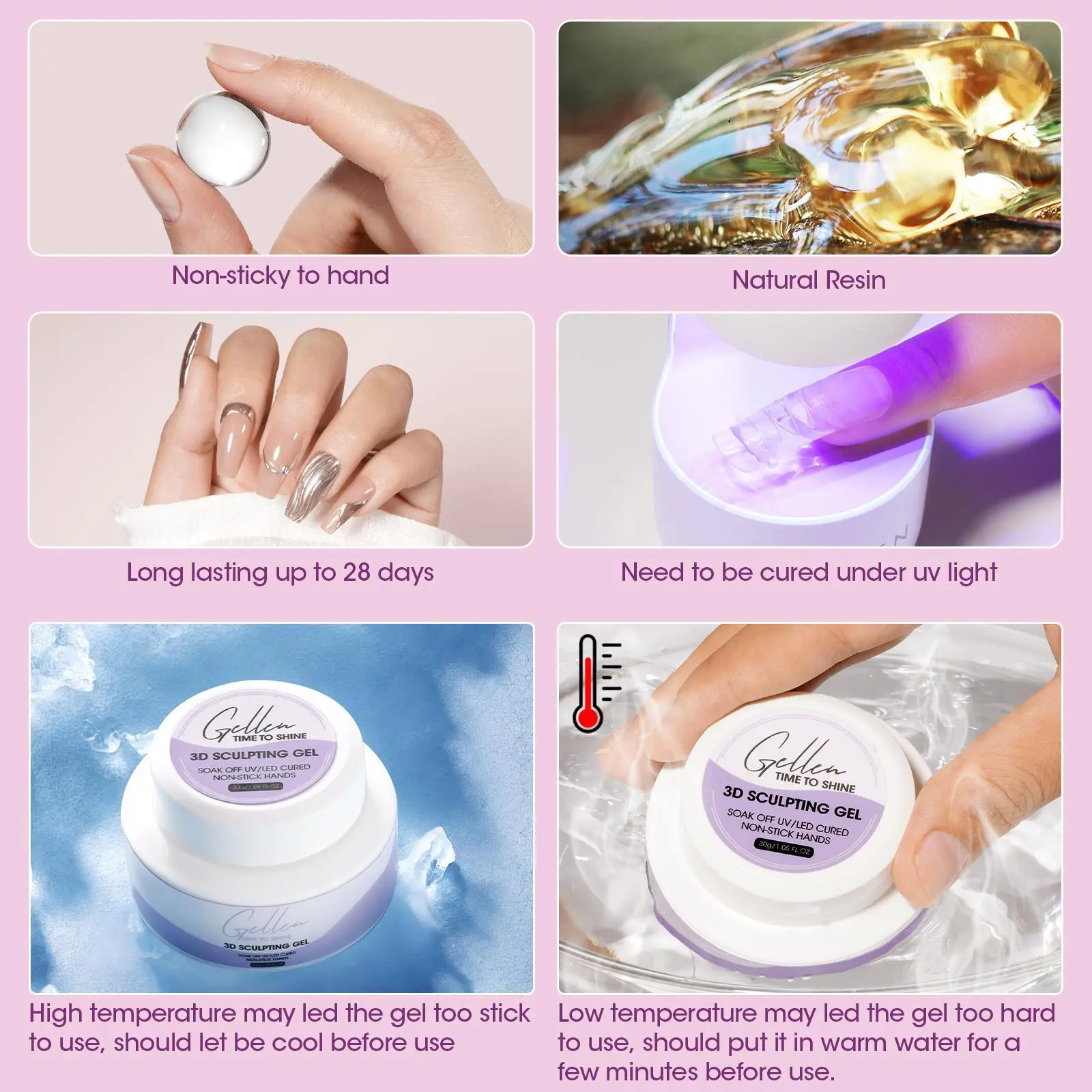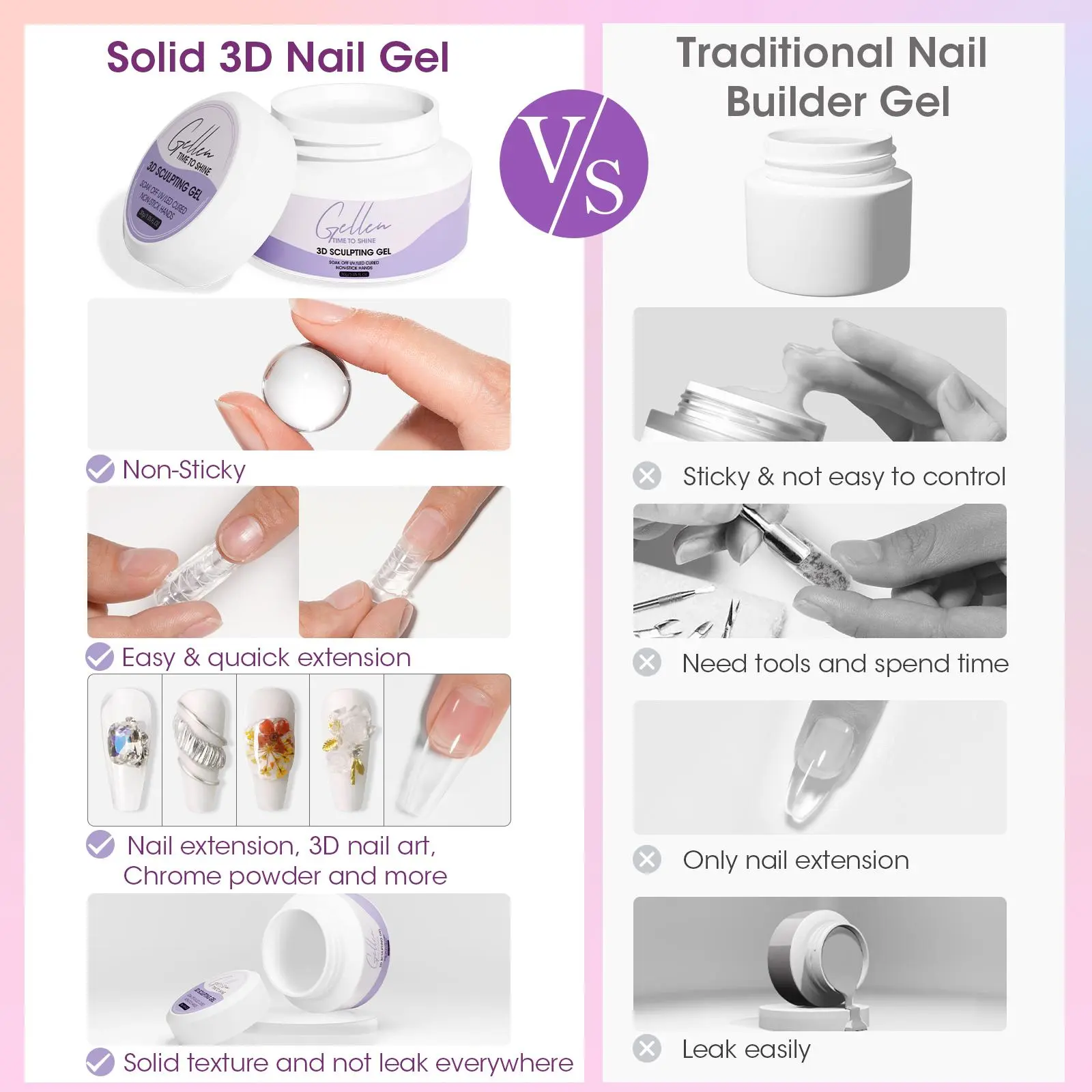 Gellen 3D Gel Nail Art Kit - Clear 3D Nail Art Sculpting Gel Non-Sticky to Hand, 3D Nail Gel for DIY, Hard Nail Gel Extension Gel, Carving Gel with 3D Silicone Mold Resin Durable