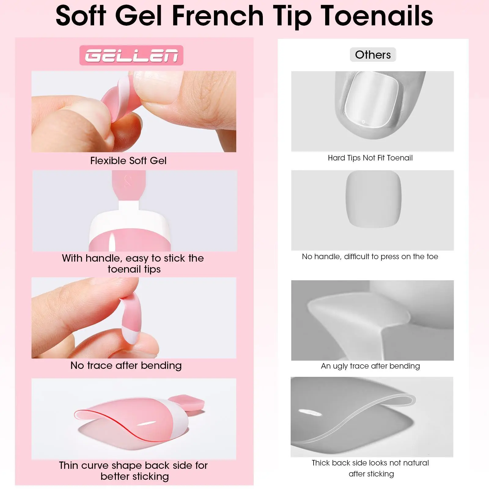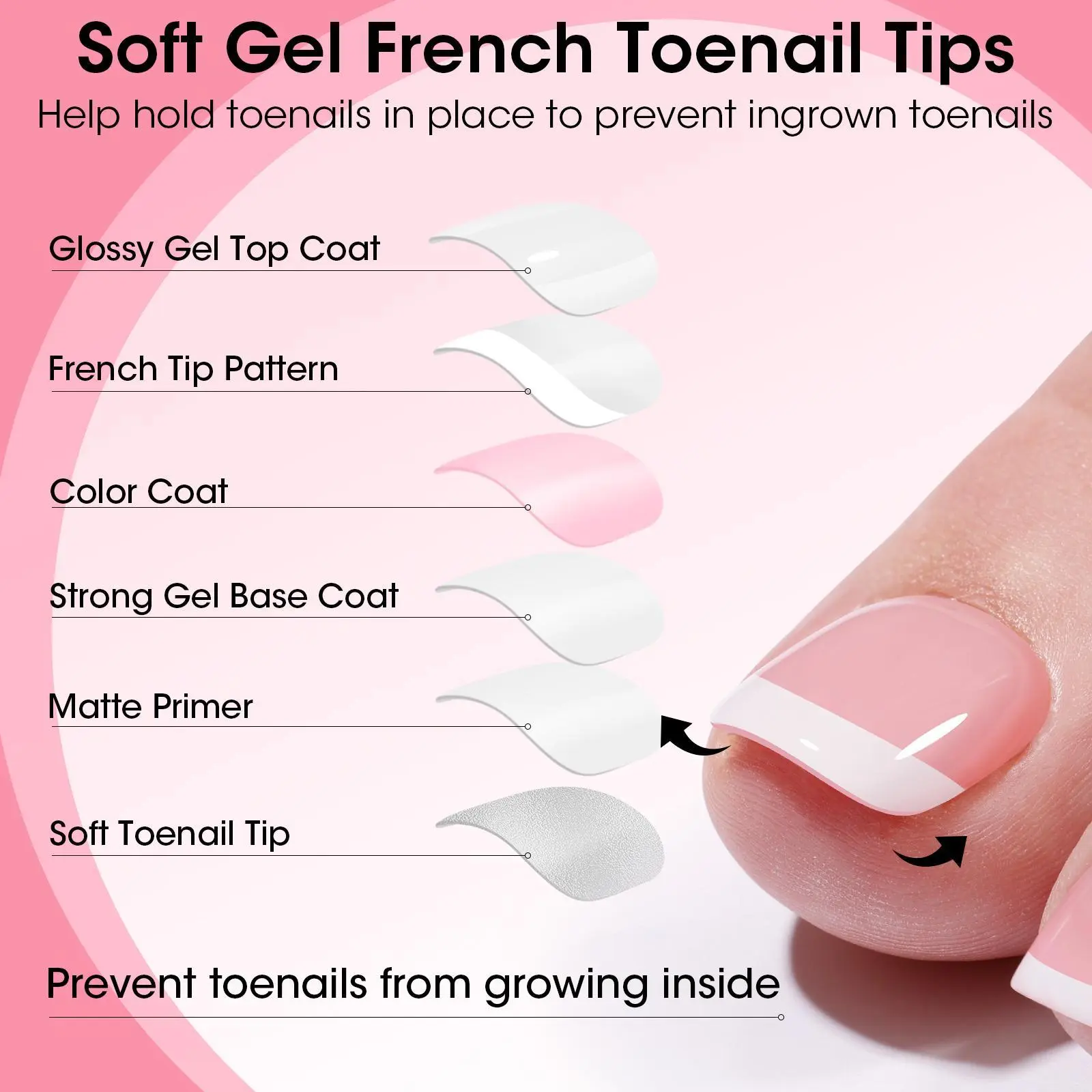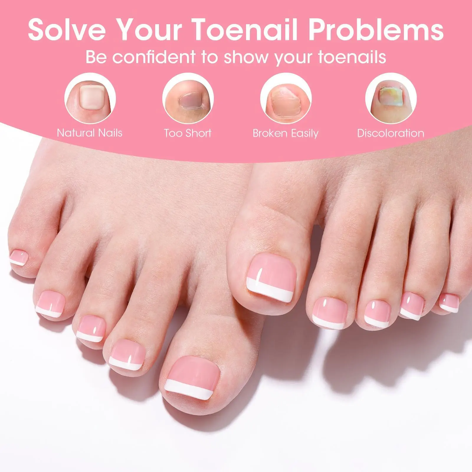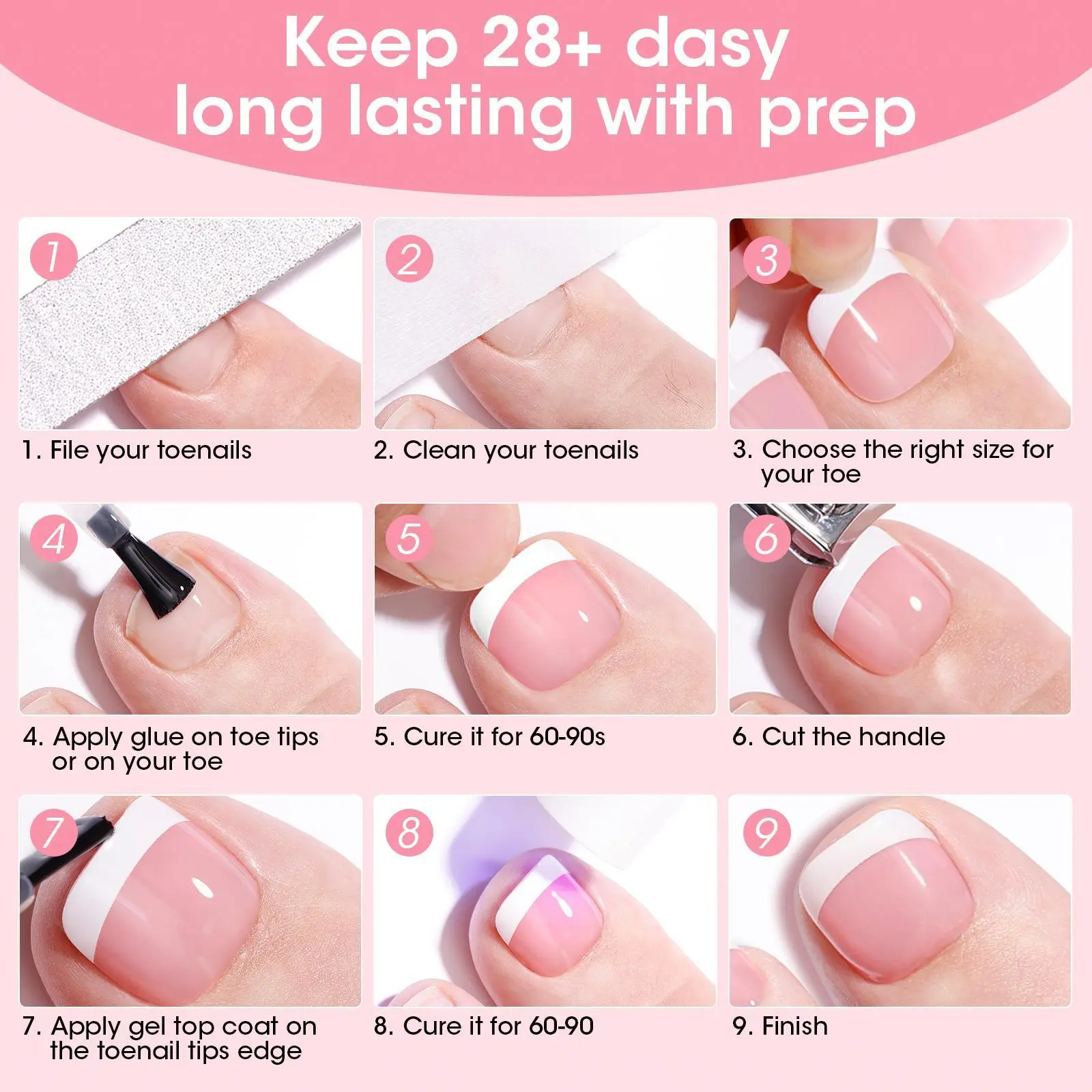 Quick Salon Pedicure at Home Get a salon-quality pedicure in minutes with Gellen French Tip Toe Nail Tips. These press-on pink tips require no painting-just press and go for flawless toes in under 10 minutes.