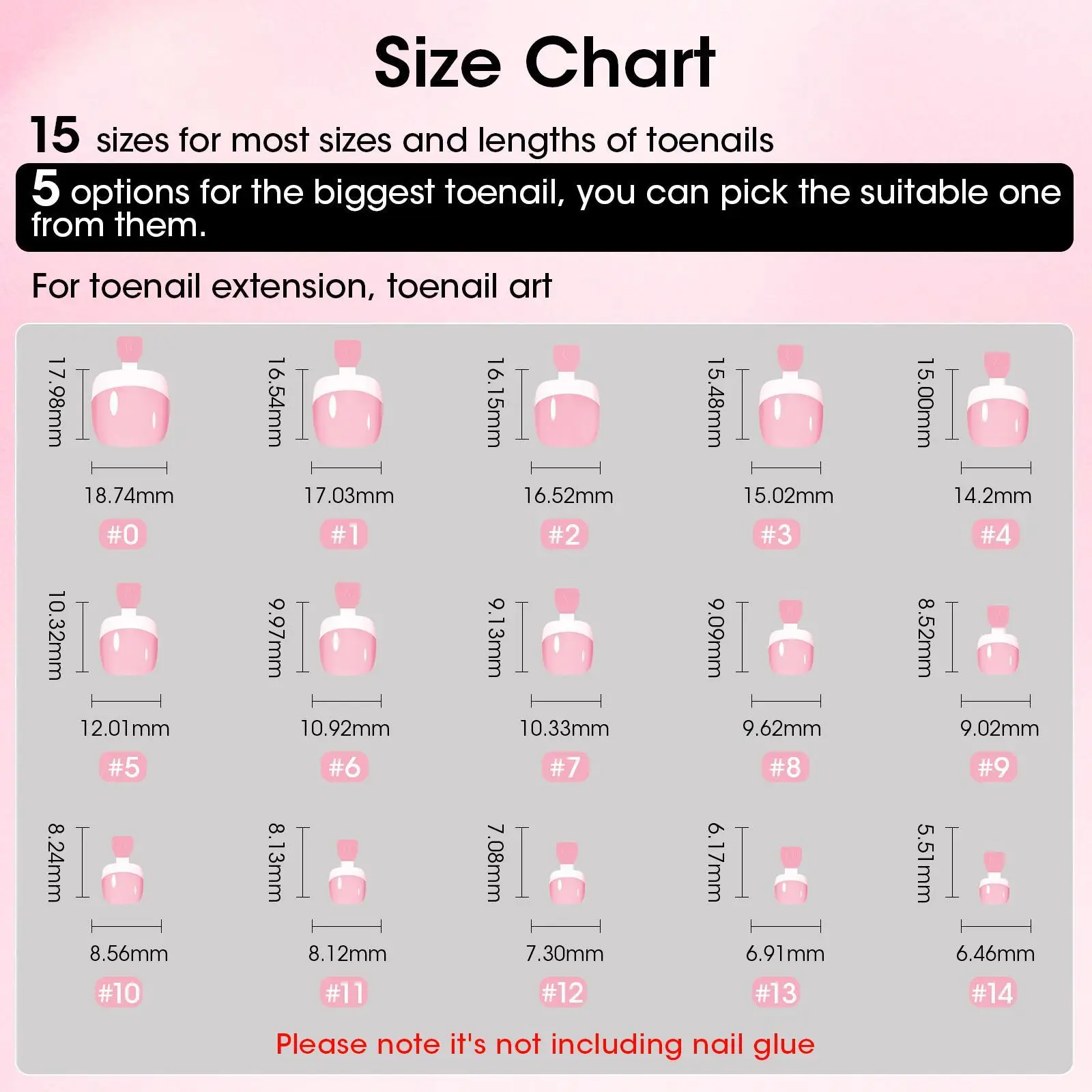 Perfect Fit for Every Toe Each set includes 240 tips in 15 sizes, so you can easily find the perfect fit. Skip the trimming—just press and reveal beautifully uniform toes.