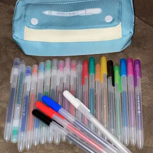 Like the pens although they don't seem quite as big as a normal gelly roll and the little pencil case had a broken button.
