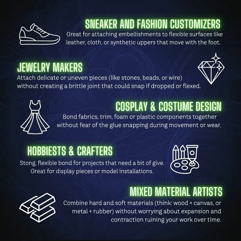Engineered specifically for artists, this unique blend of cyanoacrylate maintains a strong, lasting bond while allowing finished works of art to bend, move, and endure stress without cracking or breaking.