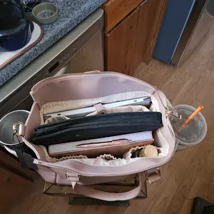 The perfect work bag. I'm always coming & going I require alot of items esp if I take residents on outings. I'm carrying their money+personal items ontop of mine w/ laptop & planner. I always take a 40oz cup it's not easy to stop at stores. This is a game changer it's stuffed full but great
