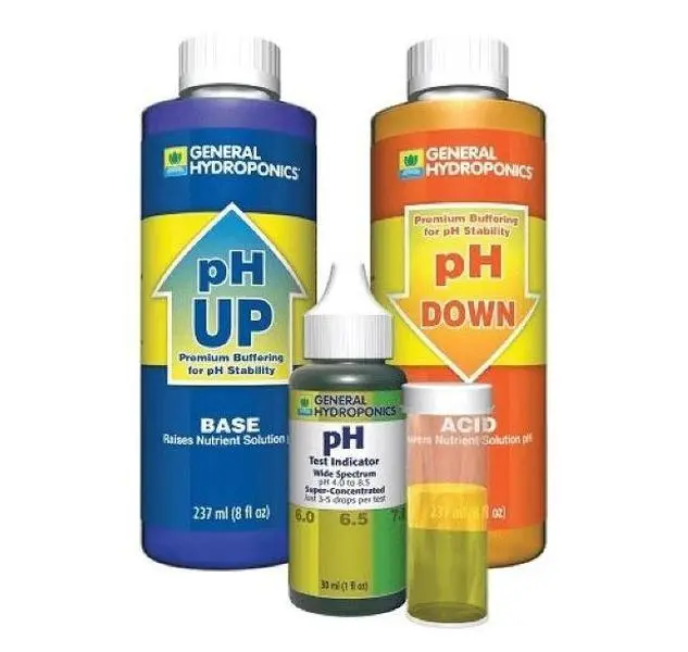 Contains 8 oz Ph Up (add a little at a time when your nutrient pH is too low in order to raise the pH to the proper level), 8 oz Ph Down (uses food grade Phosphoric acid to lower the pH to the proper level), and Ph Test Indicator (fill a test-tube halfway with nutrient, add a few drops of pH Test Indicator, and observe the coloration of the liquid in the test vial. Use 3 drops per 5mL of solution). Keep out of reach of children.