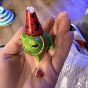 The painting on the had was done by hand and not done well. The frogs are cute but the quality ain’t there. Why did I receive approximately 20 crappy plastic stars with no adhesive. Straight to the trash.