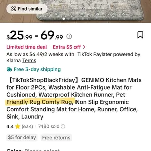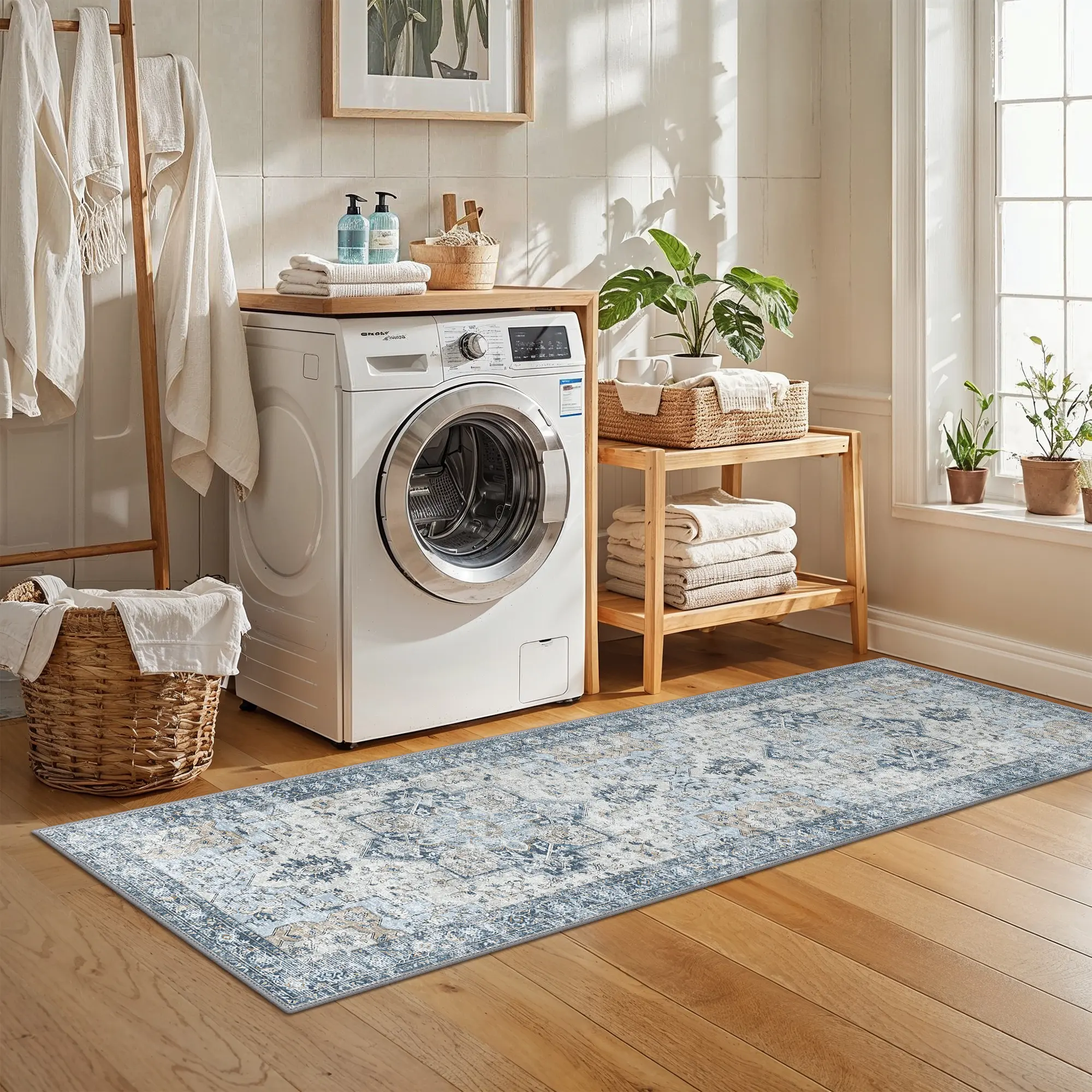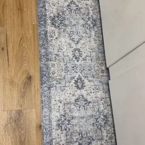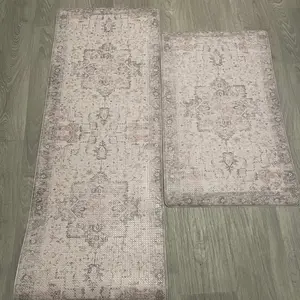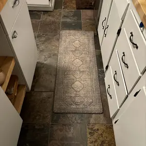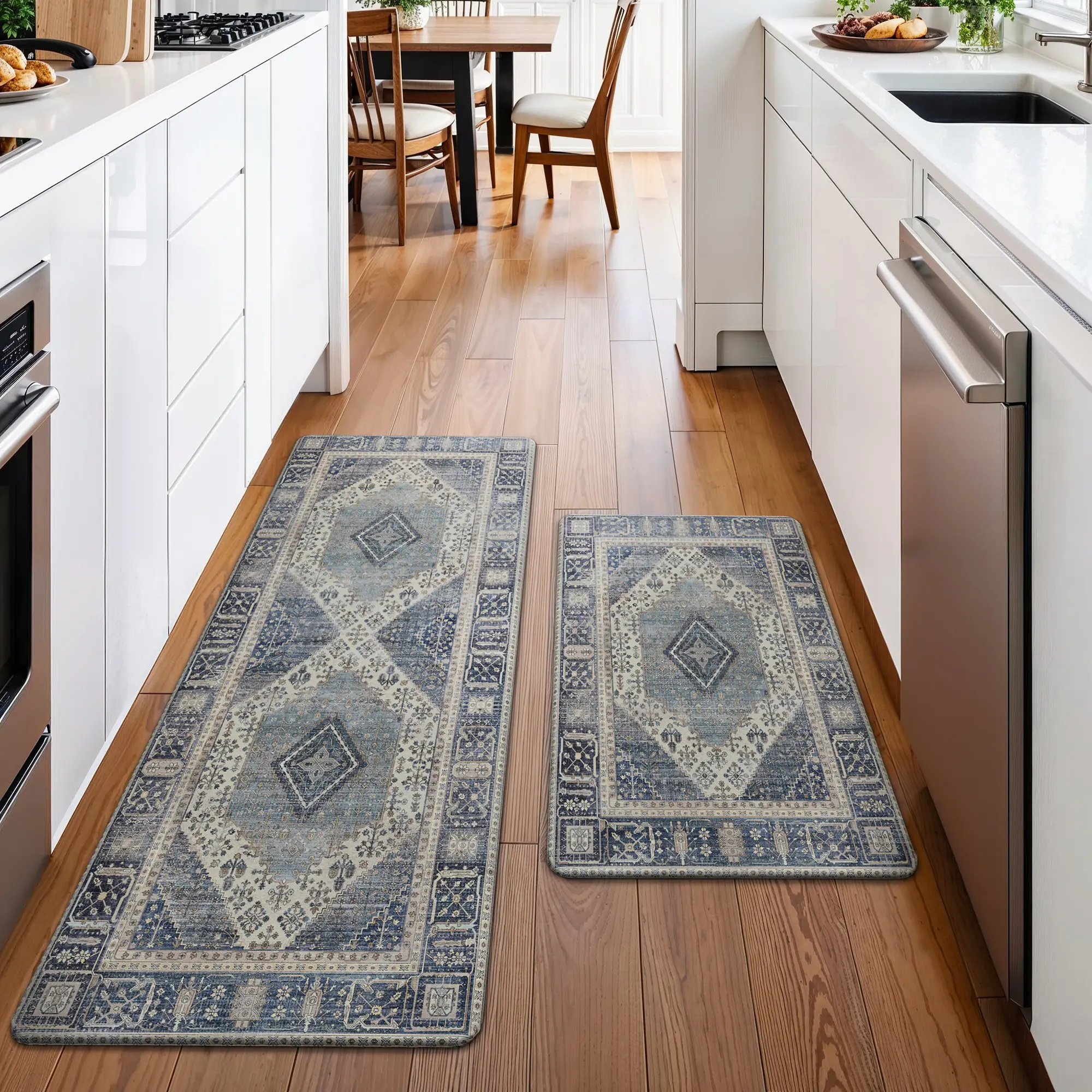 This GENIMO kitchen mat blends modern, classic, and boho styles, enhancing any home decor. It offers a unique look that complements various aesthetics. The mat is ideal for kitchen workstations or small hallways, measuring 17.3"x47" + 17.3"x30". It's perfect for standing areas and smaller spaces.