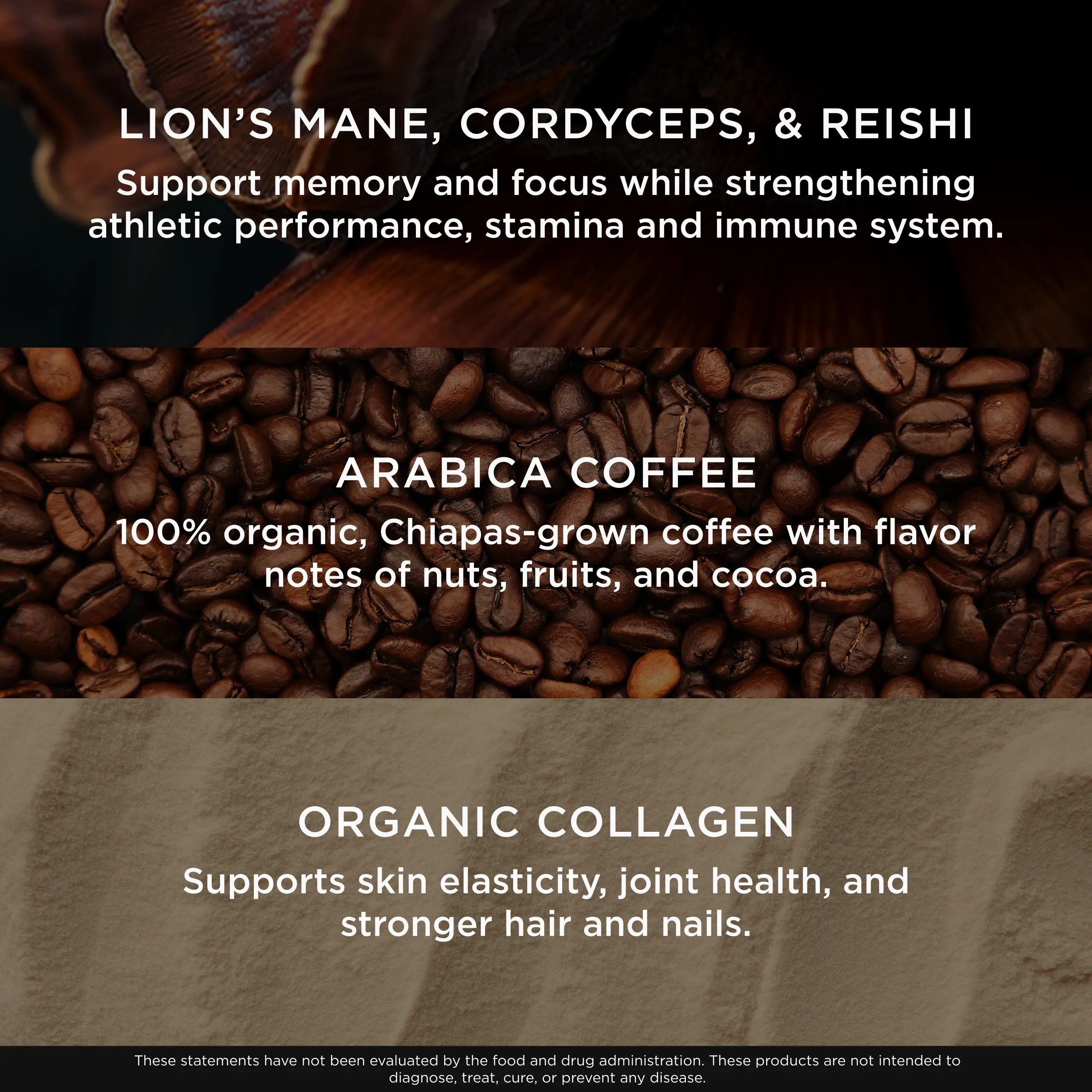 Genius Mushroom Coffee Plus Collagen: Experience the smooth taste of 100% certified organic arabica coffee blended with a full-spectrum mushroom blend and organic collagen