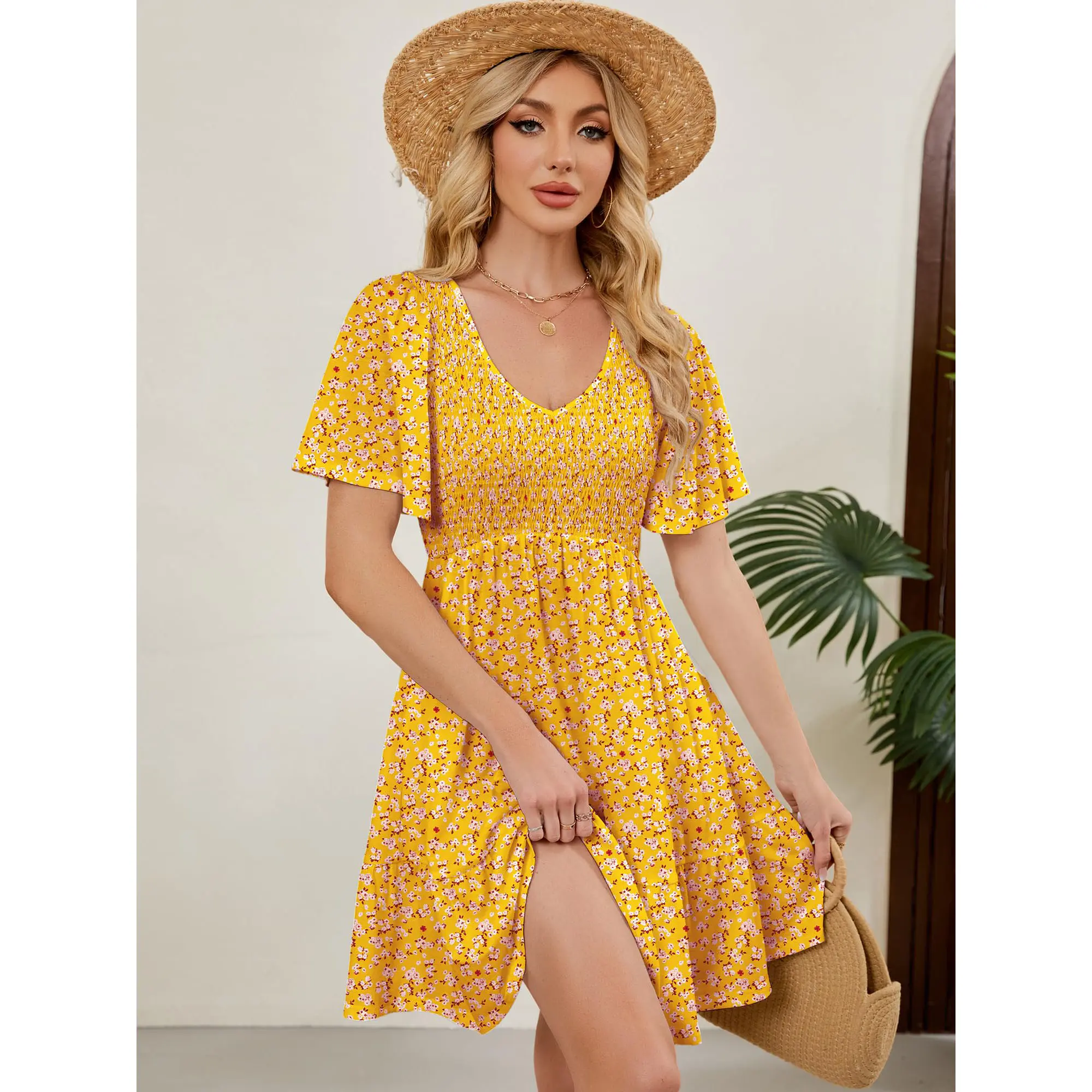 5. Genleck Women's Summer Floral Print Mini Dress - V Neck Flutter Sleeve Boho Sundress with Pockets for Vacation & Party